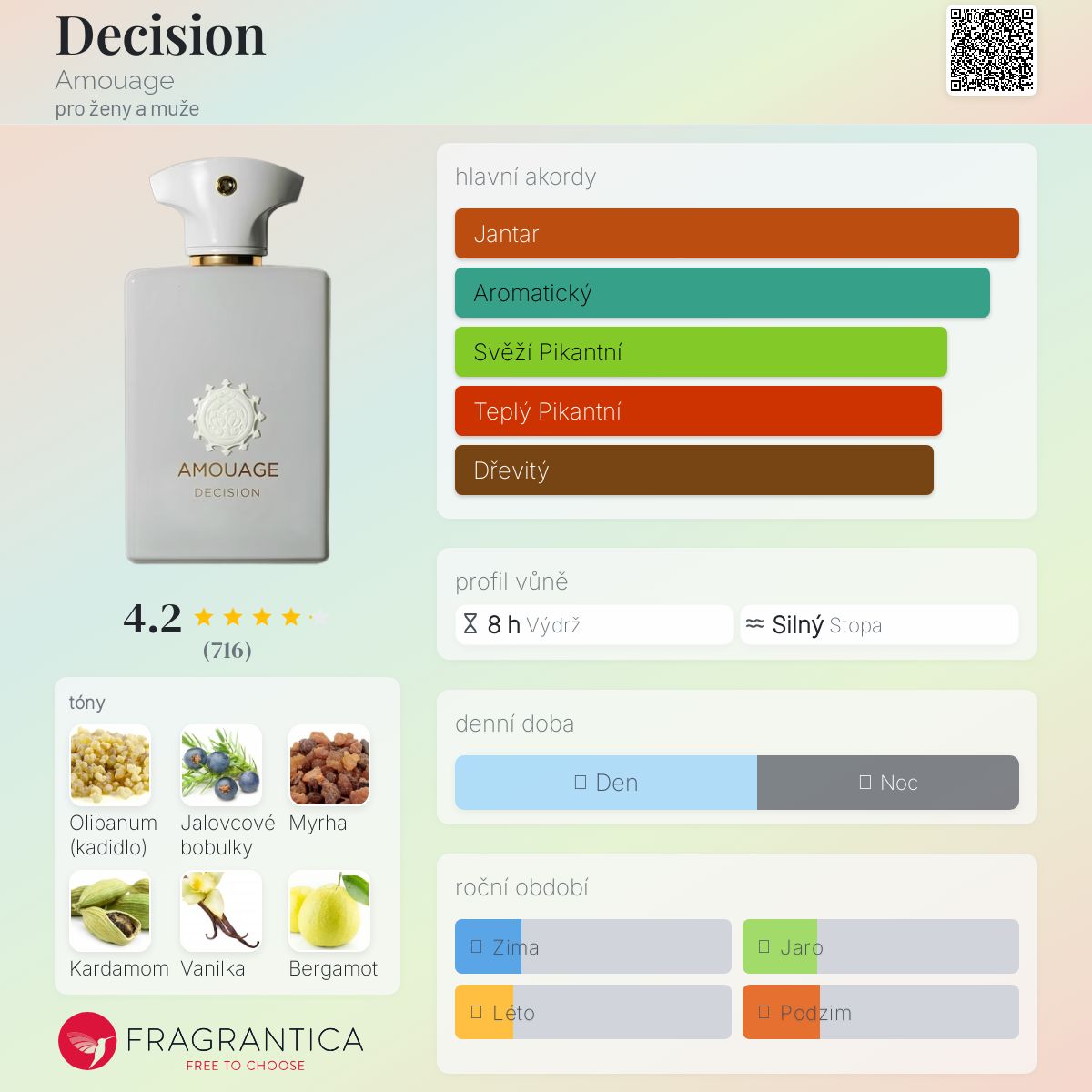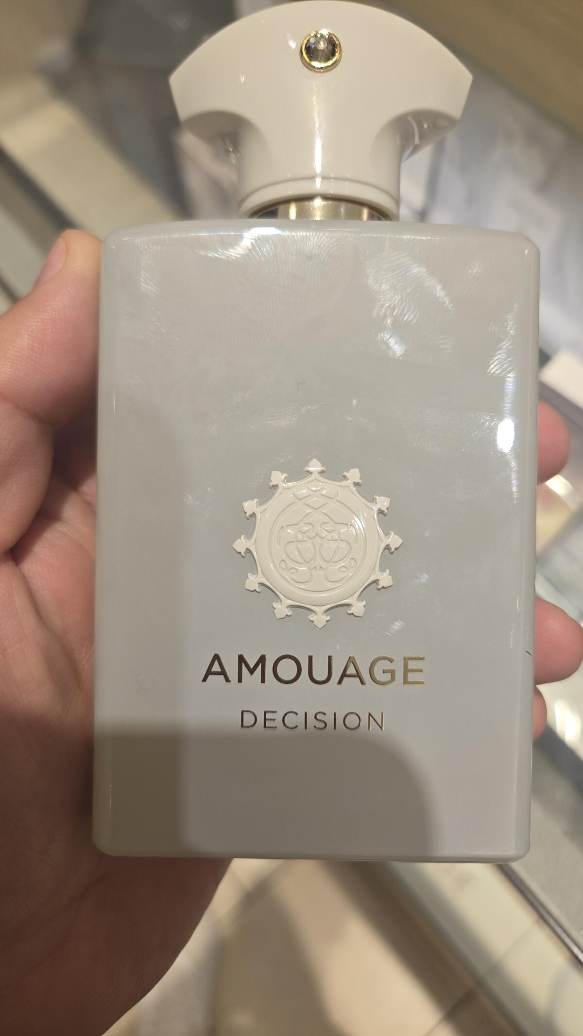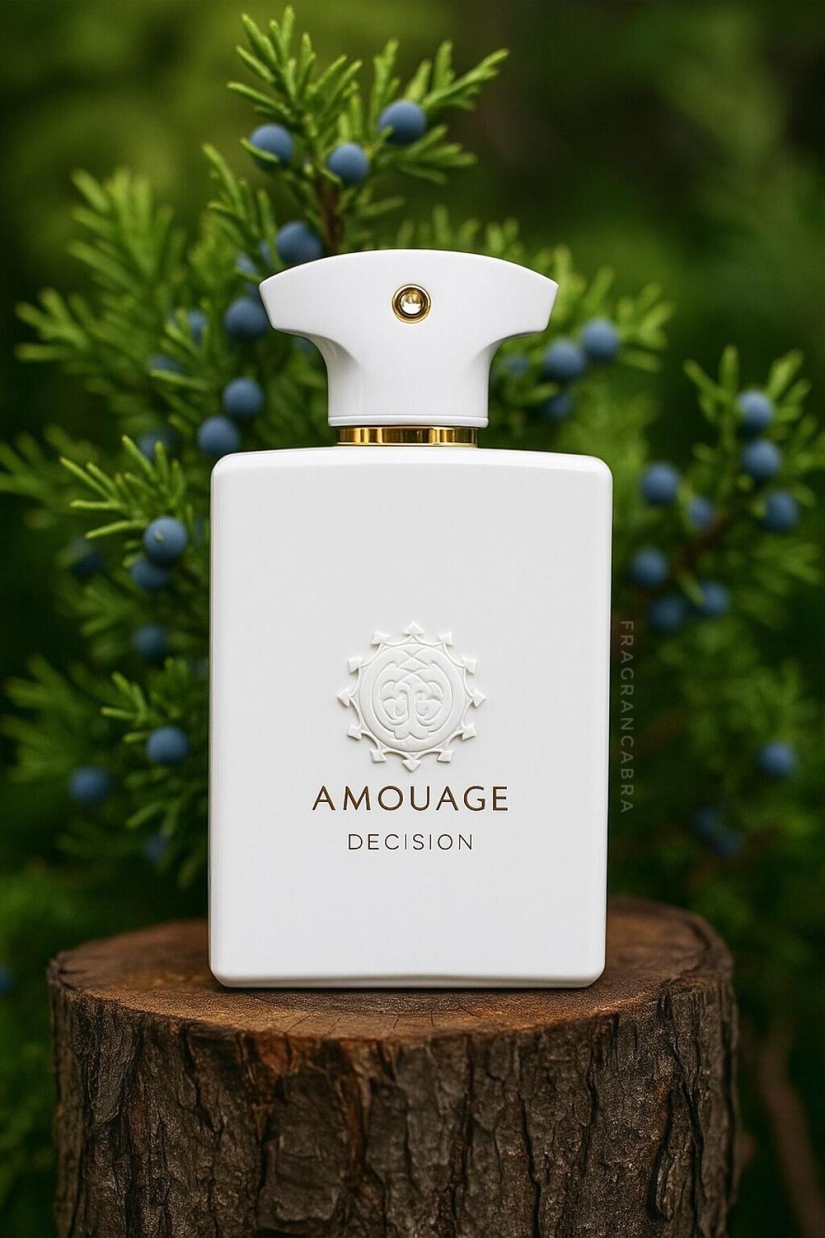 Decision podle Amouage je Woody Aromatic vůně pro ženy a muže. Toto je nová vůně. Decision byl/a uveden/a v roce 2025. "Nosem" za touto vůní je Quentin Bisch. Vrchní tóny jsou Kardamom, Bergamot a Růžový pepř; střední tóny jsouKadidlo, Jalovcové bobulky a Myrha ; základní tóny jsou Vanilka, Cedr a Pačuli.
