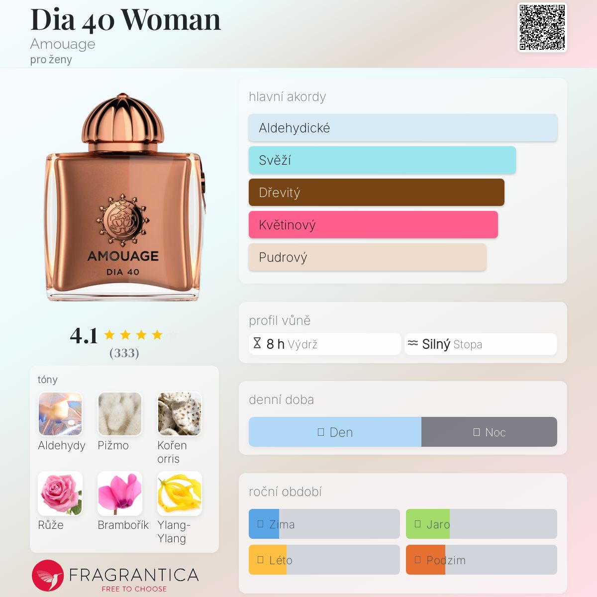 Dia 40 Woman podle Amouage je Floral Aldehyde vůně pro ženy. Dia 40 Woman byl/a uveden/a v roce 2023. "Nosem" za touto vůní je Alexandra Carlin. Vrchní tóny jsou Aldehydy, Pižmo, Brambořík, Černý rybíz a Fialkový list; střední tóny jsouRůže, Ylang-Ylang, Karafiát, Pomerančový květ, Skalní růže, Estragon a Bobkový list ; základní tóny jsou Kořen orris, Santalové dřevo, Amyris a Guajakové dřevo.
