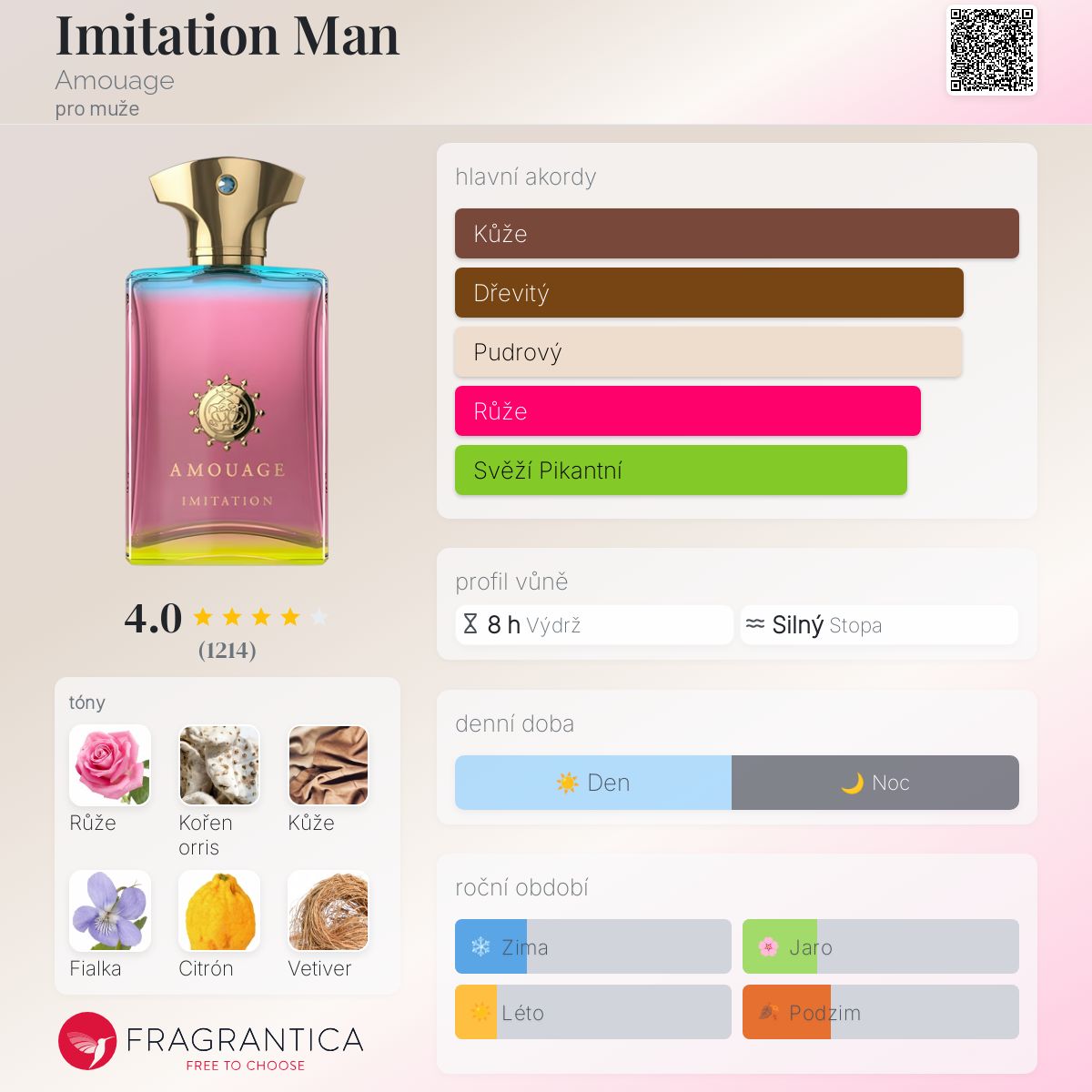 Imitation Man podle Amouage je Leather vůně pro muže. Imitation Man byl/a uveden/a v roce 2018. "Nosem" za touto vůní je Leslie Girard. Vrchní tóny jsou Zedrát, Muškátový oříšek a Černý pepř; střední tóny jsouTurecká růže, Orris a Fialka ; základní tóny jsou Kůže, Vetiver, Kastoreum, Pačuli a Myrha.