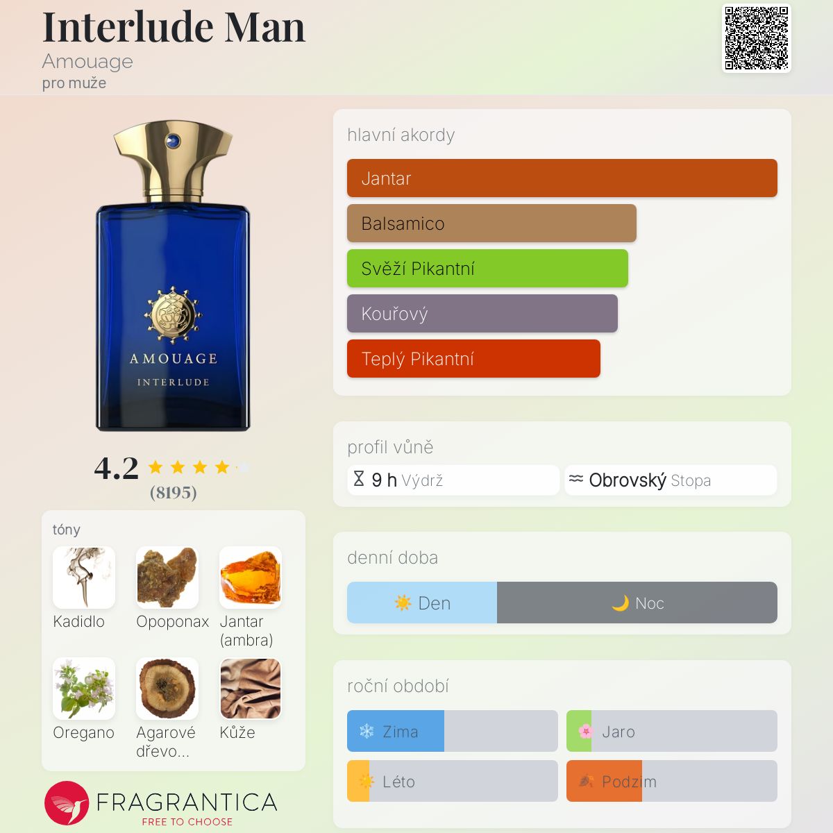 Interlude Man podle Amouage je Orientální Woody vůně pro muže. Interlude Man byl/a uveden/a v roce 2012. "Nosem" za touto vůní je Pierre Negrin. Vrchní tóny jsou Oregano, Pepř a Bergamot; střední tóny jsouKadidlo, Opoponax, Jantar (ambra) a Labdanum ; základní tóny jsou Agarové dřevo (oud), Kůže, Santalové dřevo a Pačuli.
