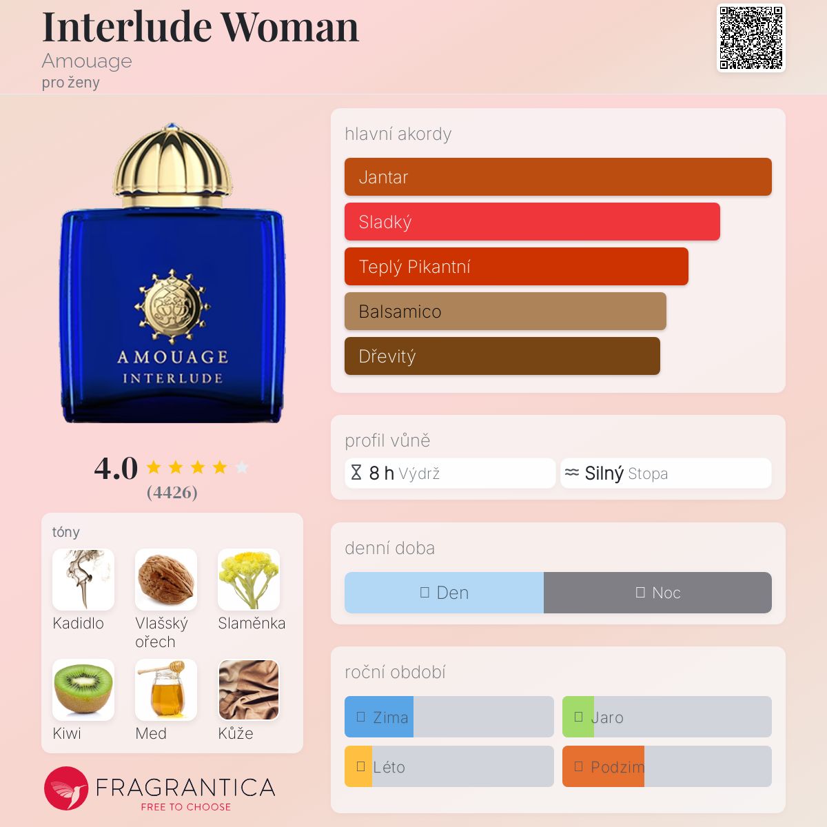 Interlude Woman podle Amouage je Chypre Floral vůně pro ženy. Interlude Woman byl/a uveden/a v roce 2012. "Nosem" za touto vůní je Karine Vinchon Spehner. Vrchní tóny jsou Měsíček, Zázvor, Grapefruit a Bergamot; střední tóny jsouKadidlo, Vlašský ořech, Slaměnka, Kiwi, Med, Opoponax, Káva, Santalové dřevo, Růže, Pomerančový květ a Jasmín ; základní tóny jsou Kůže, Benzoin, Agarové dřevo (oud), Jantar (ambra), Santalové dřevo, Fazole tonka, Dubový mech, Vanilka a Pižmo.