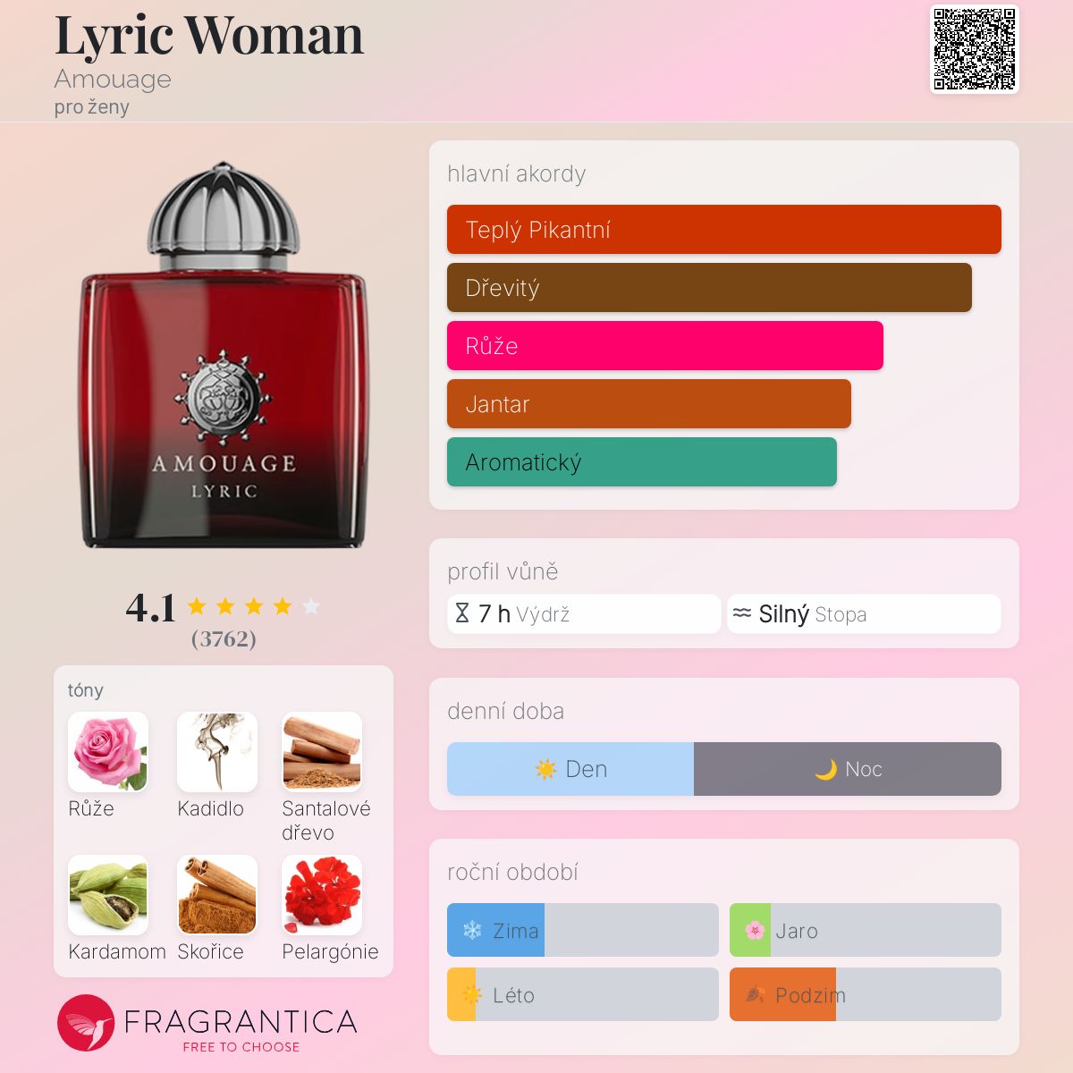 Lyric Woman podle Amouage je Orientální Floral vůně pro ženy. Lyric Woman byl/a uveden/a v roce 2008. "Nosem" za touto vůní je Daniel Maurel. Vrchní tóny jsou Kardamom, Skořice, Zázvor a Bergamot; střední tóny jsouRůže, Pelargónie, Ylang-Ylang, Kořen orris, Andělika a Jasmín ; základní tóny jsou Kadidlo, Santalové dřevo, Dřevité tóny, Pižmo, Pačuli, Fazole tonka, Dubový mech, Vanilka a Vetiver.