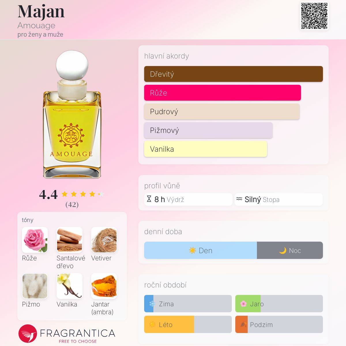 Majan podle Amouage je Orientální Floral vůně pro ženy a muže. Vrchní tóny jsou Růže a Vanilka; střední tóny jsouVetiver a Pižmo ; základní tóny jsou Santalové dřevo a Jantar (ambra).
