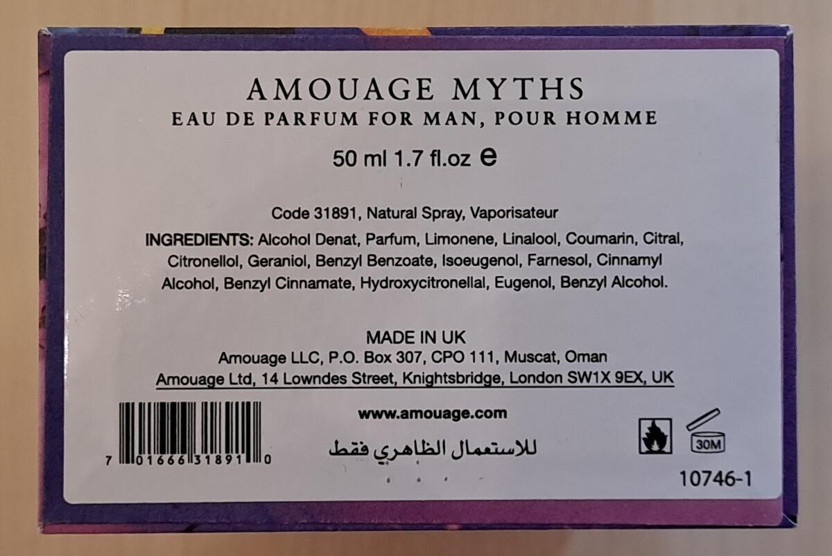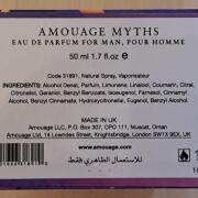 Myths Man podle Amouage je Orientální vůně pro muže. Myths Man byl/a uveden/a v roce 2016. Myths Man byl/a vytvořen/a Daniel Visentin, Dorothée Piot a Karine Vinchon Spehner. Vrchní tóny jsou Chryzantéma a Orris; střední tóny jsouElimi, Rum, Vetiver a Růže ; základní tóny jsou Popel, Kůže a Labdanum.