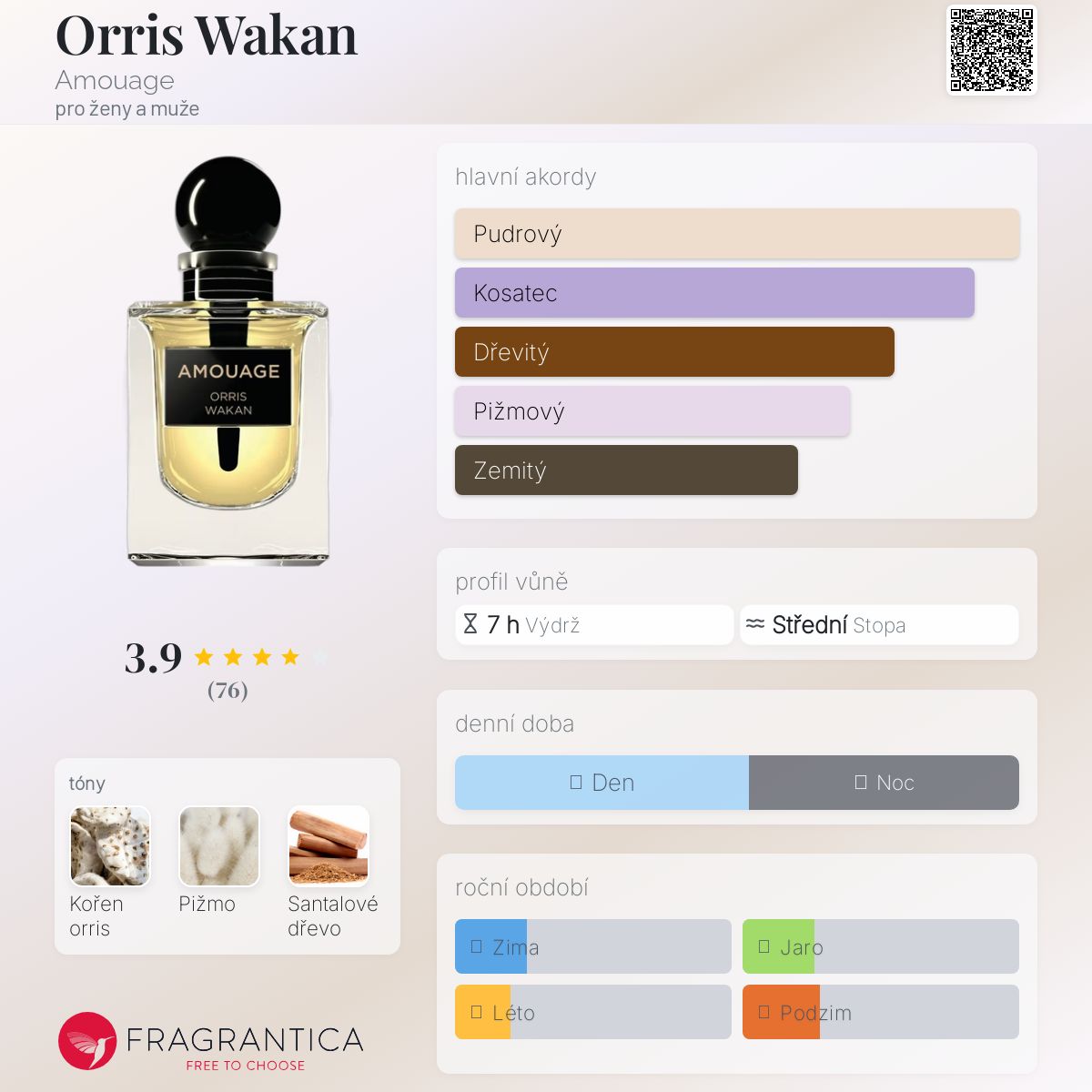 Orris Wakan podle Amouage je Floral Woody Musk vůně pro ženy a muže. Orris Wakan byl/a uveden/a v roce 2021. "Nosem" za touto vůní je Julien Rasquinet.