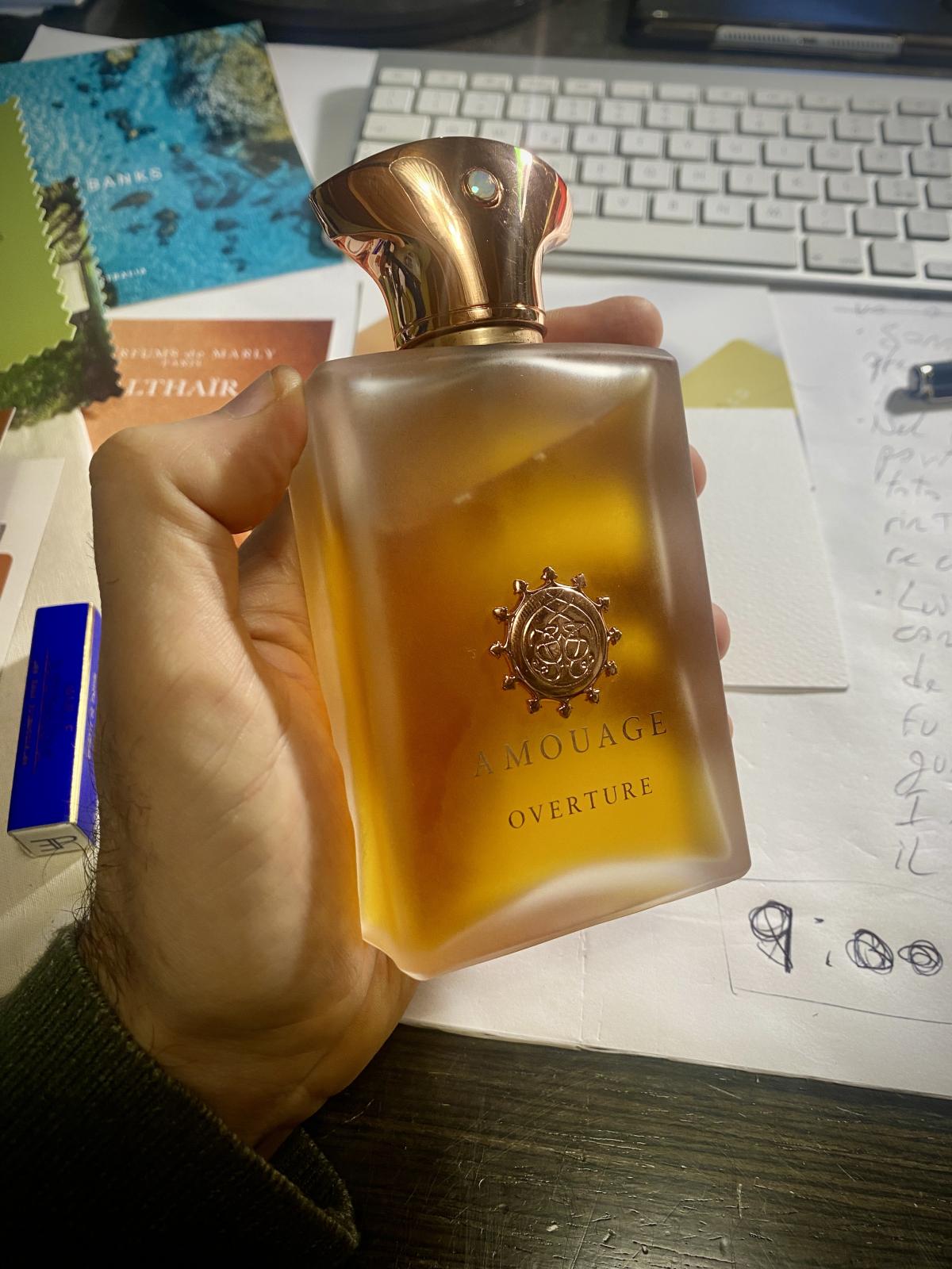 Overture Man podle Amouage je Woody Spicy vůně pro muže. Overture Man byl/a uveden/a v roce 2019. "Nosem" za touto vůní je Karine Vinchon Spehner. Vrchní tóny jsou Koňak, Kmín, Kardamom, Šafrán, Muškátový oříšek, Zázvor a Grapefruit; střední tóny jsouMyrha, Benzoin, Skořice, Labdanum, Masticha, Pačuli a Pelargónie ; základní tóny jsou Zvířecí tóny, Kouř, Kadidlo, Kůže, Santalové dřevo a Šalvěj muškátová.