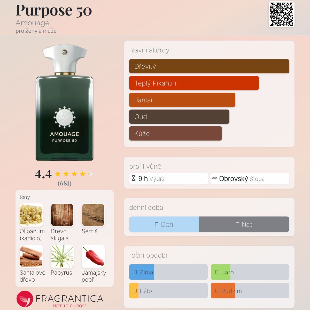 Purpose 50 podle Amouage je Woody Spicy vůně pro ženy a muže. Toto je nová vůně. Purpose 50 byl/a uveden/a v roce 2025. "Nosem" za touto vůní je Quentin Bisch. Vrchní tóny jsou Kadidlo, Jamajský pepř, Růžový pepř a Bergamot; střední tóny jsouSantalové dřevo, Papyrus, Vetiver a Růže ; základní tóny jsou Dřevo akigala, Semiš, Vanilka, Mystikal a Šafrán.