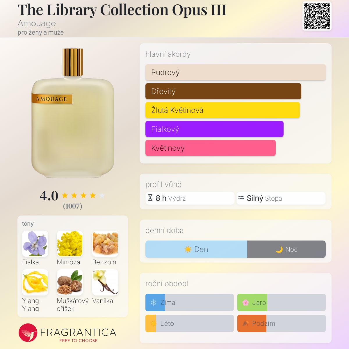 The Library Collection Opus III podle Amouage je Orientální Floral vůně pro ženy a muže. The Library Collection Opus III byl/a uveden/a v roce 2010. "Nosem" za touto vůní je Karine Vinchon Spehner. Vrchní tóny jsou Mimóza, Muškátový oříšek, Hřebíček, Kručinka barvířská a Tymián; střední tóny jsouFialka, Ylang-Ylang, Jasmín a Květ afrického pomeranče ; základní tóny jsou Benzoin, Vanilka, Santalové dřevo, Guajakové dřevo, Pižmo, Ambrette (přírodní pižmo), Papyrus a Virginský cedr.