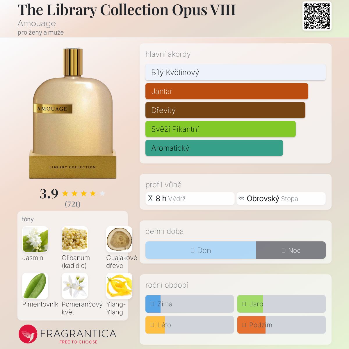 The Library Collection Opus VIII podle Amouage je Orientální Woody vůně pro ženy a muže. The Library Collection Opus VIII byl/a uveden/a v roce 2014. The Library Collection Opus VIII byl/a vytvořen/a Pierre Negrin a Richard Herpin. Vrchní tóny jsou Jasmín, Pomerančový květ a Ylang-Ylang; střední tóny jsouOlibanum, Guajakové dřevo, Šafrán, Zázvor a Vetiver ; základní tóny jsou Pimentovník a Benzoin.