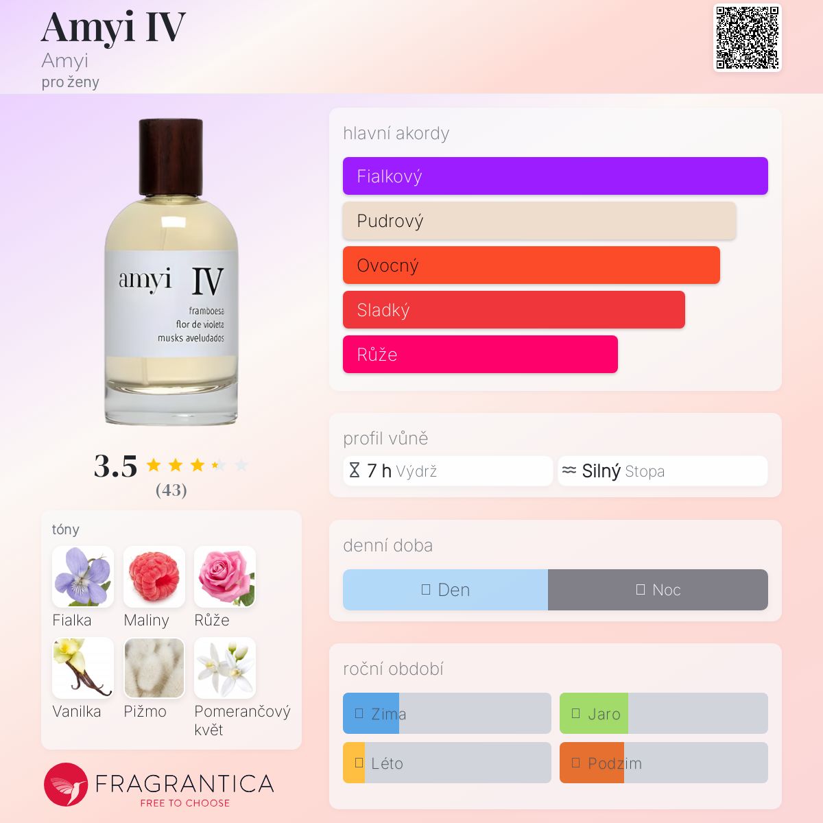 Amyi IV podle Amyi je Floral vůně pro ženy. Amyi IV byl/a uveden/a v roce 2019. "Nosem" za touto vůní je Cleber Bozzi. Vrchní tóny jsou Maliny, Bergamot a Sicilský citron; střední tóny jsouFialka, Růže a Pomerančový květ ; základní tóny jsou Vanilka, Pižmo a Santalové dřevo.