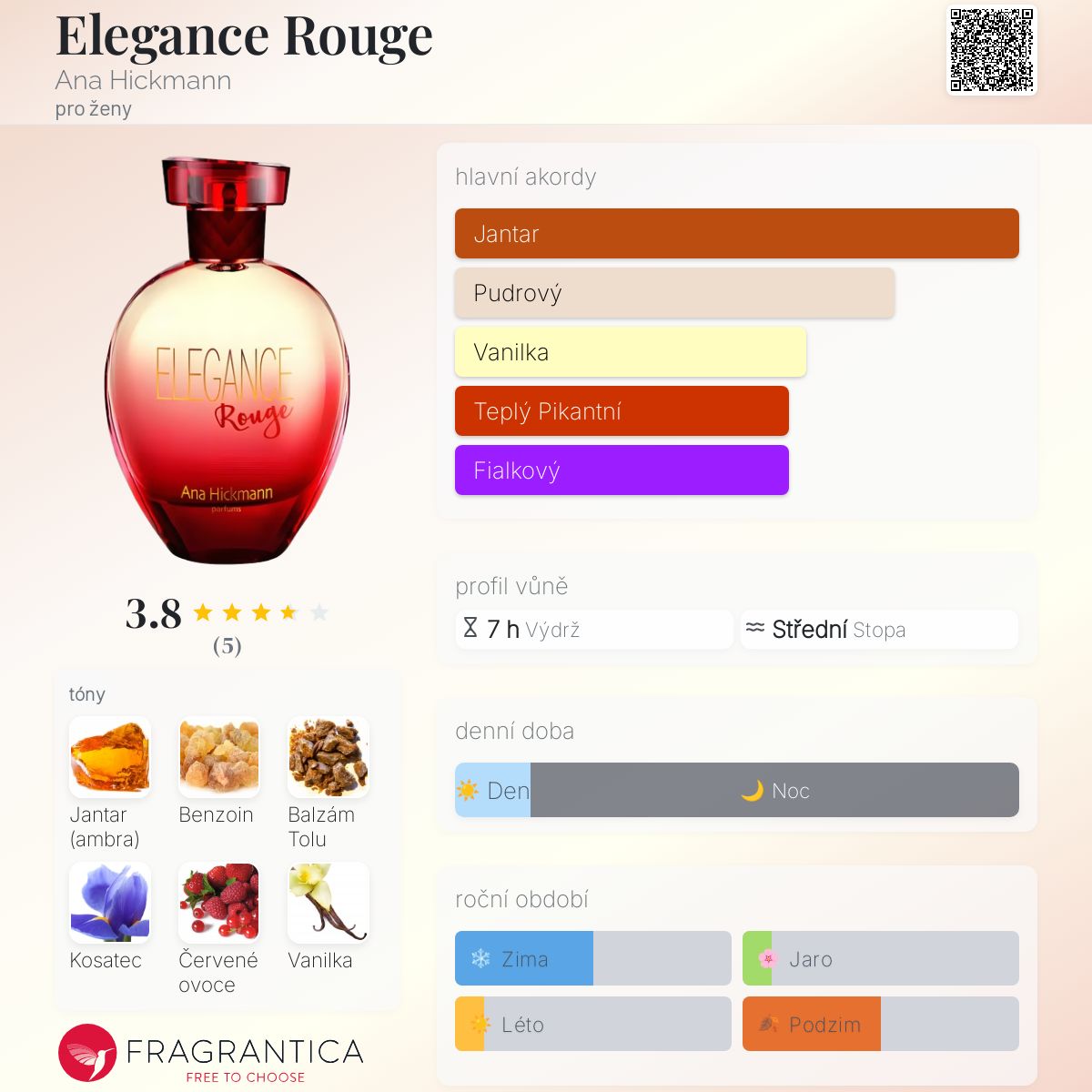 Elegance Rouge podle Ana Hickmann je Orientální Floral vůně pro ženy. Elegance Rouge byl/a uveden/a v roce 2019. "Nosem" za touto vůní je Jérôme Epinette. Vrchní tóny jsou Pomeranč, Bergamot, Jablko a Mučenka; střední tóny jsouKosatec, Červené ovoce, Fialka a Jasmín ; základní tóny jsou Jantar (ambra), Benzoin, Balzám Tolu a Vanilka.
