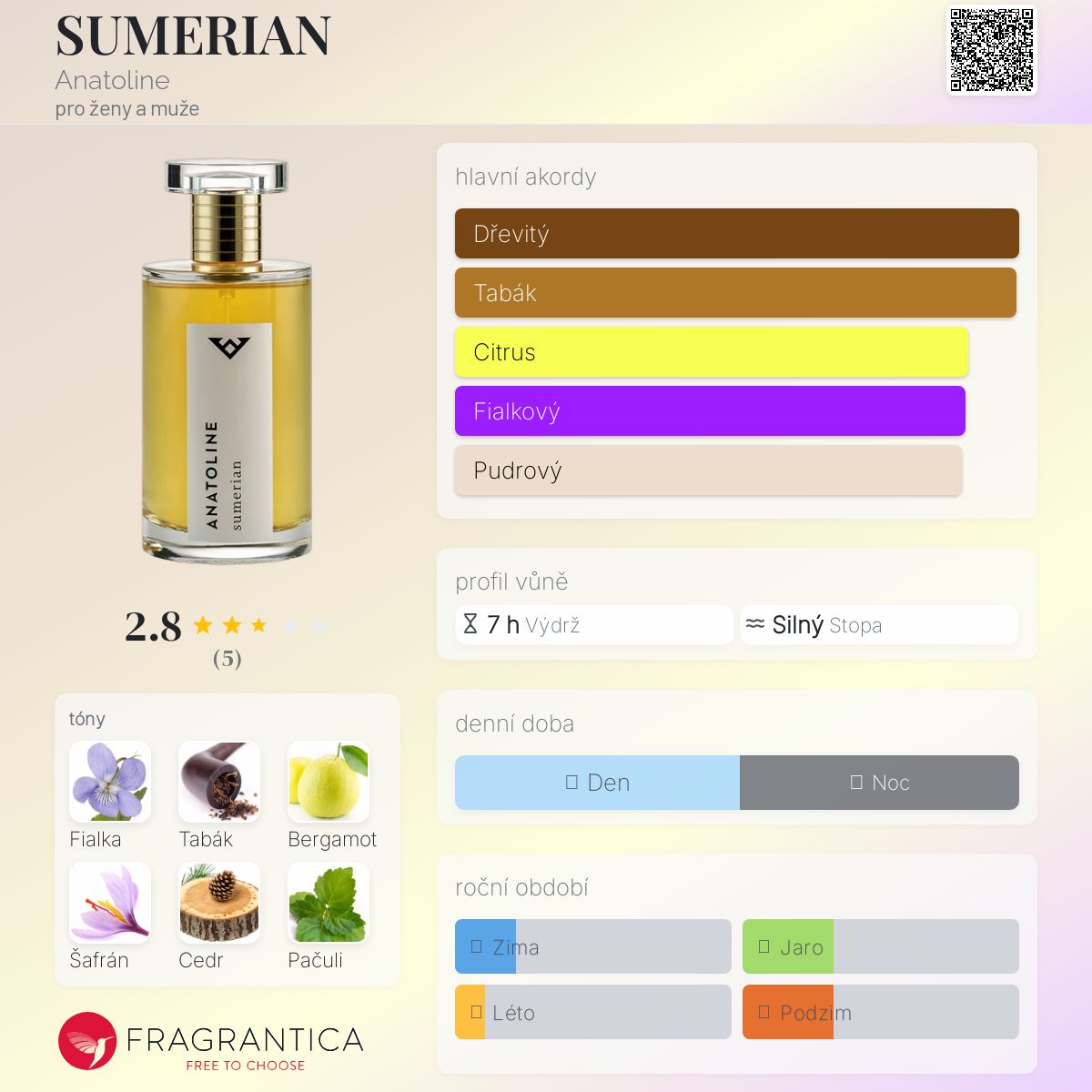 SUMERIAN podle Anatoline je Orientální Floral vůně pro ženy a muže. SUMERIAN byl/a uveden/a v roce 2018. "Nosem" za touto vůní je Mehmet Çelik. Vrchní tóny jsou Fialka, Bergamot, Šalvěj muškátová a Mandarinka; střední tóny jsouŠafrán a Konvalinka ; základní tóny jsou Tabák, Cedr, Pačuli a Jantar (ambra).