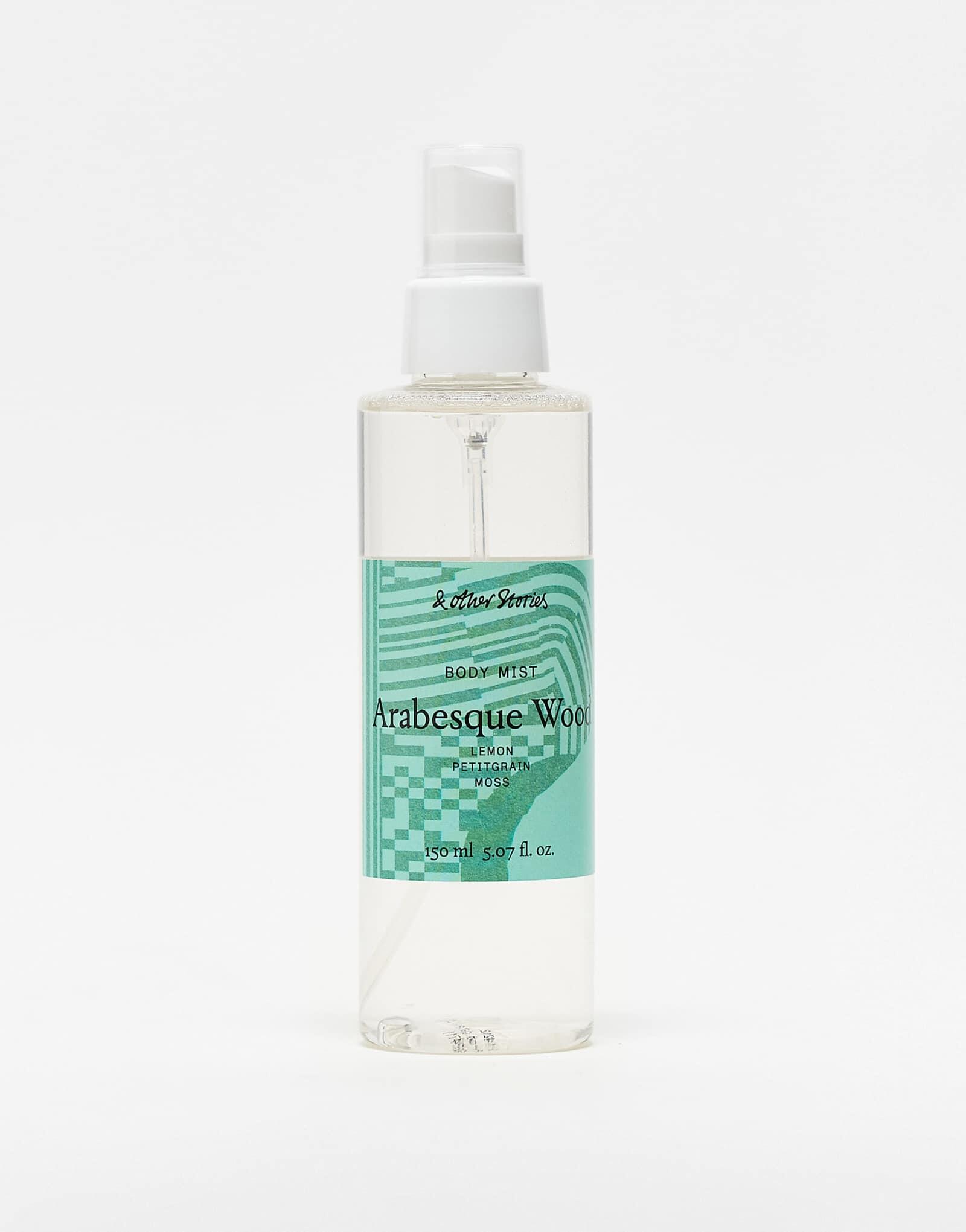 Arabesque Wood Body Mist podle And Other Stories je Woody Aromatic vůně pro ženy a muže. Arabesque Wood Body Mist byl/a uveden/a v roce 2014. "Nosem" za touto vůní je Jérôme Epinette. Vrchní tóny jsou Citrón, Zázvor a Vodní tóny; střední tóny jsouPetitgrain a Mandarinka ; základní tóny jsou Jantar (ambra), Mech a Agarové dřevo (oud).