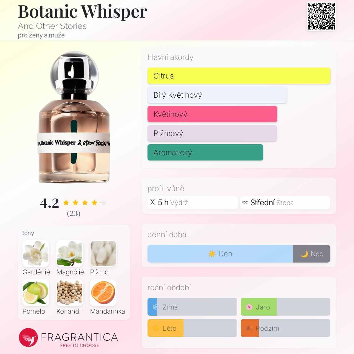 Botanic Whisper podle And Other Stories je Floral Fruity vůně pro ženy a muže. Botanic Whisper byl/a uveden/a v roce 2014. "Nosem" za touto vůní je Jérôme Epinette. Vrchní tóny jsou Pomelo, Koriandr a Mandarinka; střední tóny jsouGardénie, Magnólie a Ylang-Ylang ; základní tóny jsou Pižmo a Švestka.