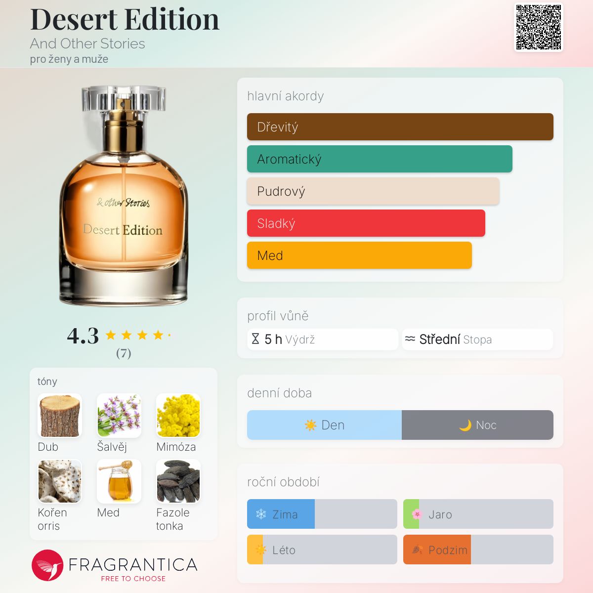 Desert Edition podle And Other Stories je Woody vůně pro ženy a muže. Toto je nová vůně. Desert Edition byl/a uveden/a v roce 2024. Vrchní tóny jsou Šalvěj, Pistácie a Kardamom; střední tóny jsouMimóza, Orris a Sušené ovoce ; základní tóny jsou Dub, Med a Fazole tonka.