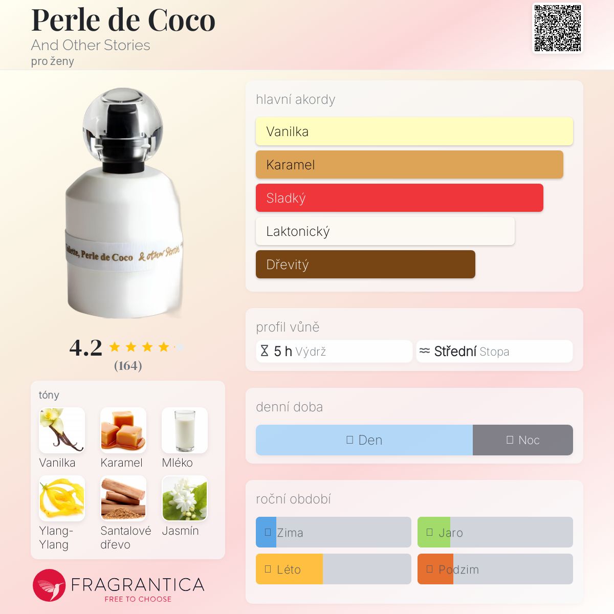 Perle de Coco podle And Other Stories je Floral Fruity Gourmand vůně pro ženy. Perle de Coco byl/a uveden/a v roce 2017. "Nosem" za touto vůní je Jérôme Epinette. Vrchní tóny jsou Karamel a Červené jablko; střední tóny jsouYlang-Ylang, Jasmín a Bambus ; základní tóny jsou Vanilka, Mléko a Santalové dřevo.