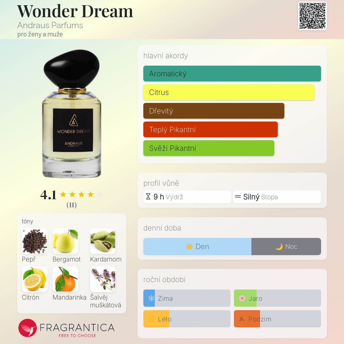 Wonder Dream podle Andraus Parfums je vůně pro ženy a muže. Wonder Dream byl/a uveden/a v roce 2023. "Nosem" za touto vůní je Patrick Bodifee. Vrchní tóny jsou Černý pepř, Bergamot, Kardamom, Citrón a Mandarinka; střední tóny jsouŠalvěj muškátová, Levandule, Bříza a Borovice ; základní tóny jsou Pačuli a Jantar (ambra).