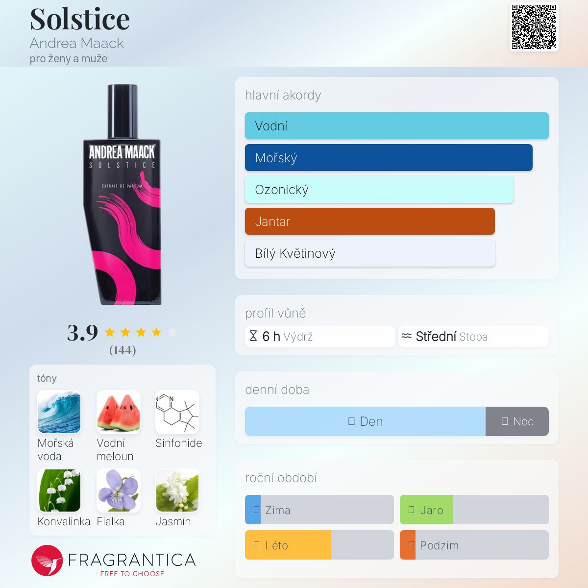 Solstice podle Andrea Maack je vůně pro ženy a muže. Solstice byl/a uveden/a v roce 2023. "Nosem" za touto vůní je Julien Rasquinet. Vrchní tóny jsou Mořské tóny a Vodní meloun; střední tóny jsouKonvalinka, Fialka a Jasmín ; základní tóny jsou Sinfonide a Jantar (ambra).