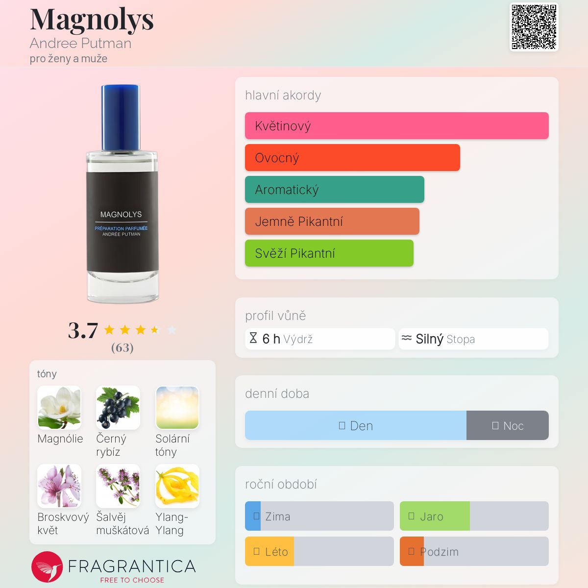 Magnolys podle Andree Putman je Floral vůně pro ženy a muže. Magnolys byl/a uveden/a v roce 2015. Vrchní tóny jsou Černý rybíz a Broskvový květ; střední tóny jsouMagnólie, Ylang-Ylang a Muškátový oříšek ; základní tóny jsou Solární tóny a Šalvěj muškátová.