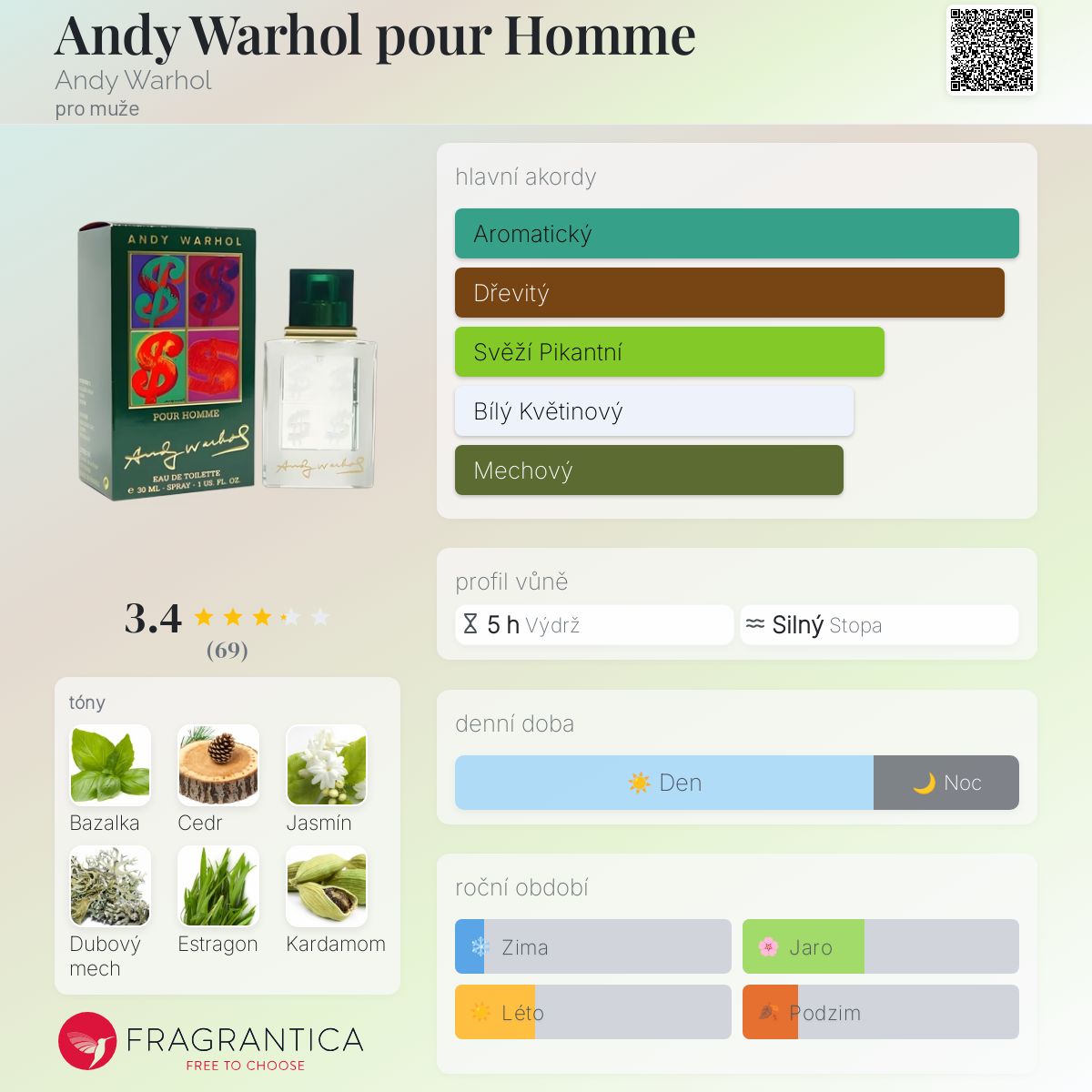 Andy Warhol pour Homme podle Andy Warhol je Aromatic Fougere vůně pro muže. Andy Warhol pour Homme byl/a uveden/a v roce 1999. "Nosem" za touto vůní je Dorothée Piot. Vrchní tóny jsou Bazalka a Estragon; střední tóny jsouJasmín a Kardamom ; základní tóny jsou Cedr, Dubový mech, Santalové dřevo a Pižmo.