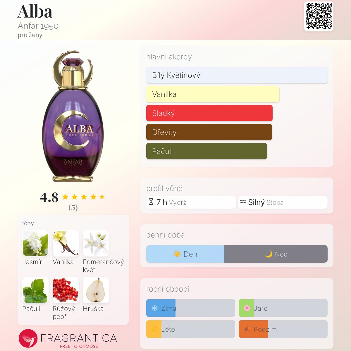 Alba podle Anfar 1950 je Orientální Floral vůně pro ženy. Alba byl/a uveden/a v roce 2023. "Nosem" za touto vůní je Ahmedullah Anfar. Vrchní tóny jsou Francouzský pomerančový květ, Růžový pepř a Hruška; střední tóny jsouJasmín a Káva ; základní tóny jsou Vanilka, Pačuli a Cedr.