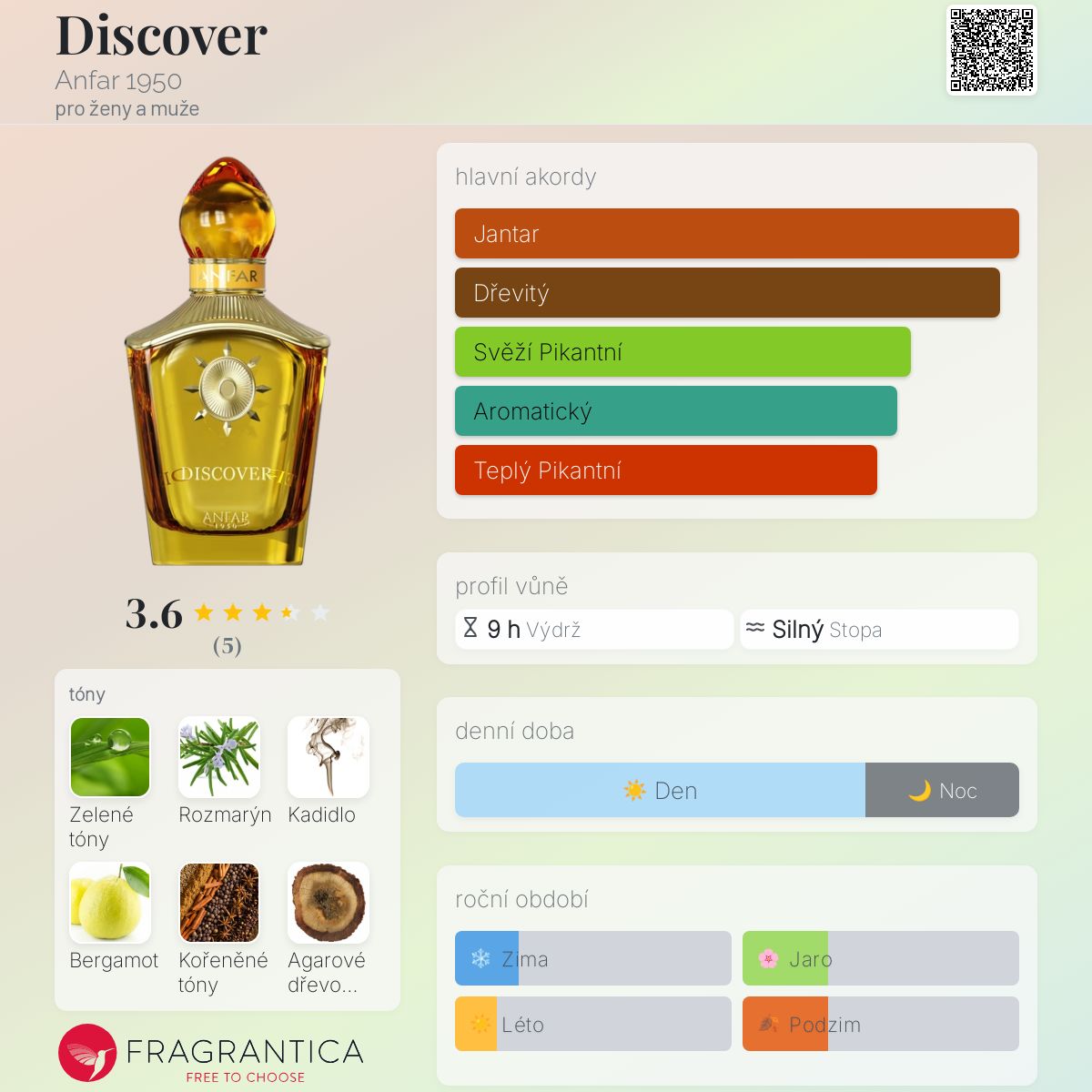 Discover podle Anfar 1950 je Aromatic Spicy vůně pro ženy a muže. Toto je nová vůně. Discover byl/a uveden/a v roce 2024. "Nosem" za touto vůní je Ahmedullah Anfar. Vrchní tóny jsou Zelené tóny, Rozmarýn a Bergamot; střední tóny jsouKoření, Dřevité tóny, Cedr a Káva ; základní tóny jsou Kadidlo, Agarové dřevo (oud), Jantar (ambra) a Pryskyřice.