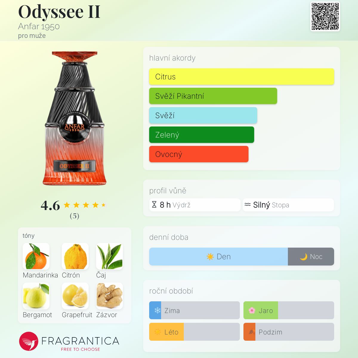 Odyssee II podle Anfar 1950 je Citrus Aromatic vůně pro muže. Odyssee II byl/a uveden/a v roce 2023. "Nosem" za touto vůní je Ahmedullah Anfar. Vrchní tóny jsou Zedrát, Bergamot a Grapefruit; střední tóny jsouMandarinka, Zelený čaj, Zázvor a Jablko ; základní tóny jsou Pelargónie, Kadidlo, Pižmo a Mech.