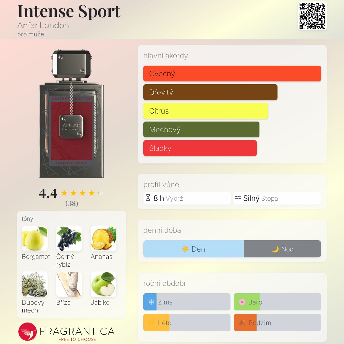 Intense Sport podle Anfar London je Chypre Fruity vůně pro muže. Toto je nová vůně. Intense Sport byl/a uveden/a v roce 2024. "Nosem" za touto vůní je Abdullah Anfar. Vrchní tóny jsou Bergamot, Černý rybíz, Ananas a Jablko; střední tóny jsouBříza, Pačuli, Růže a Marocký jasmín ; základní tóny jsou Dubový mech, Vanilka, Ambra a Pižmo.