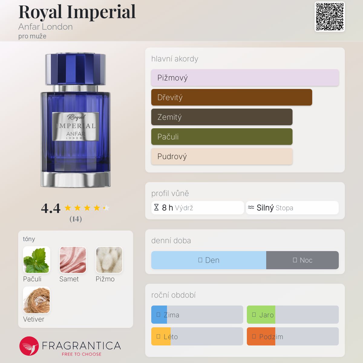 Royal Imperial podle Anfar London je Woody vůně pro muže. Royal Imperial byl/a uveden/a v roce 2021. "Nosem" za touto vůní je Mushtaque Anfar. Vrchní tóny jsou Pačuli a Samet; střední tóny jsouBílé pižmo a Pačuli ; základní tóny jsou Vetiver a Pižmo.