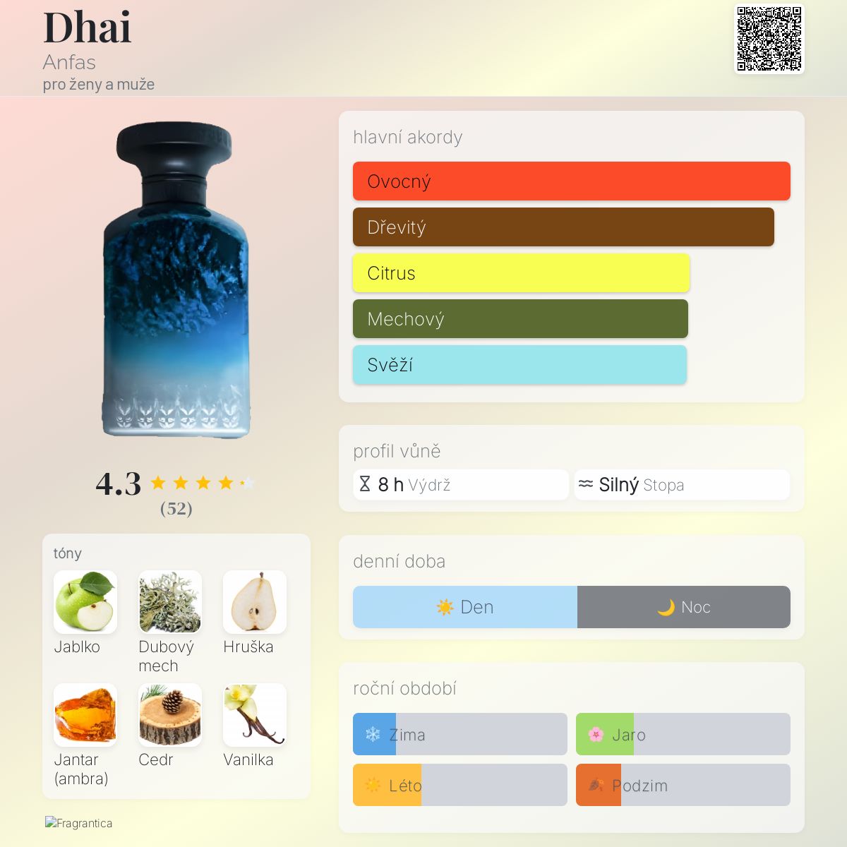 Dhai podle Anfas je vůně pro ženy a muže. Dhai byl/a uveden/a v roce 2022. Vrchní tóny jsou Jablko, Citrón, Grapefruit a Levandule; střední tóny jsouHruška, Jantar (ambra), Cedr, Pelargónie, Vetiver a Růže ; základní tóny jsou Dubový mech, Jantar (ambra), Vanilka, Pižmo a Santalové dřevo.