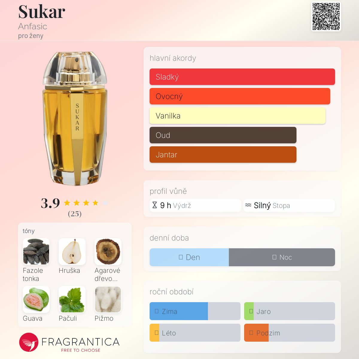 Sukar podle Anfasic je Orientální Vanilla vůně pro ženy. Vrchní tóny jsou Hruška a Guava; střední tóny jsouFazole tonka a Pačuli ; základní tóny jsou Agarové dřevo (oud) a Pižmo.