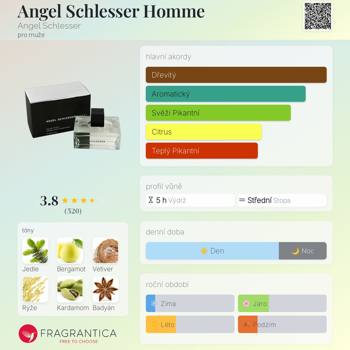 Angel Schlesser Homme podle Angel Schlesser je Aromatic Fougere vůně pro muže. Angel Schlesser Homme byl/a uveden/a v roce 2001. "Nosem" za touto vůní je Thierry Wasser. Vrchní tón je Bergamot ; střední tóny jsouVetiver, Rýže, Kardamom, Badyán, Virginský cedr, Levandule, Zázvor, Santalové dřevo a Skořice ; základní tóny jsou Jedle, Dubový mech, Pižmo a Santalové dřevo.