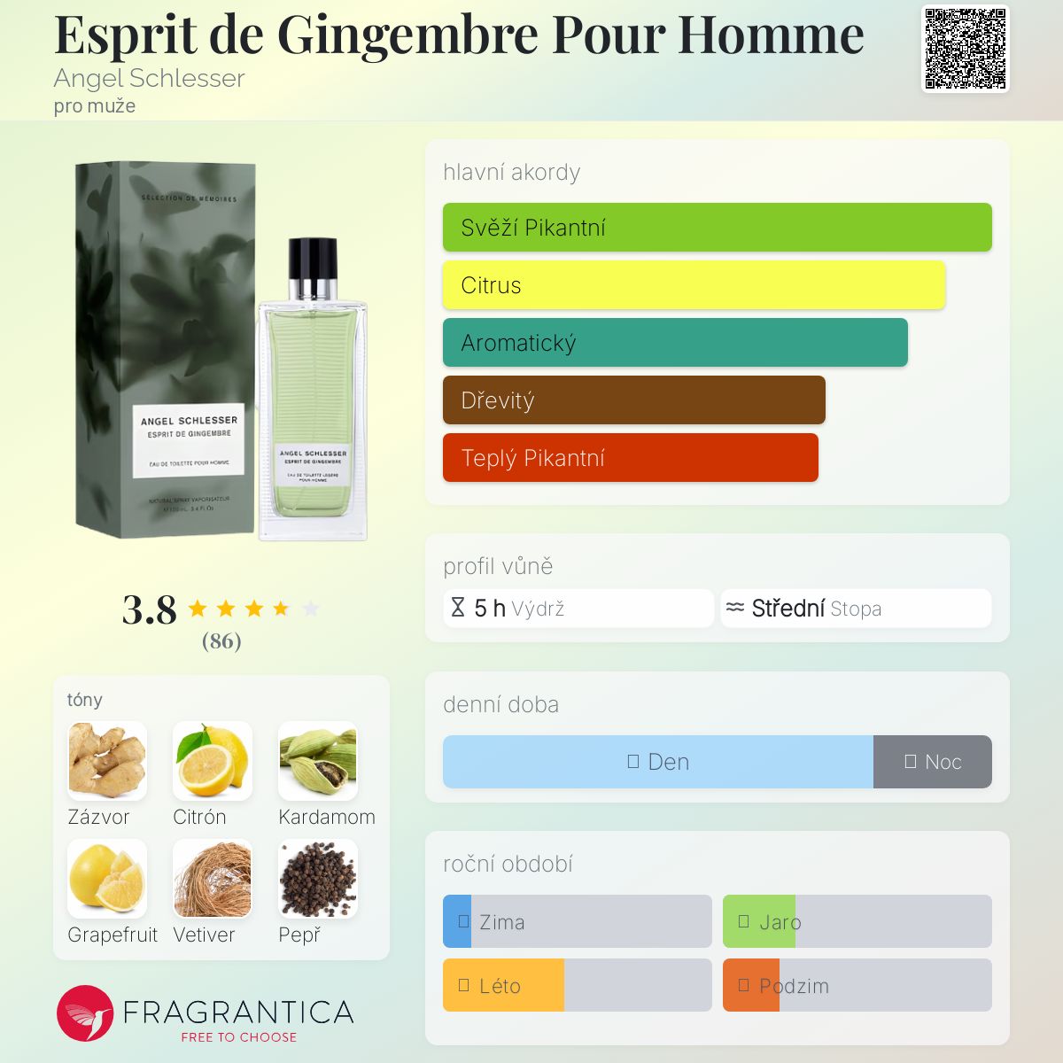 Esprit de Gingembre Pour Homme podle Angel Schlesser je Woody Spicy vůně pro muže. Esprit de Gingembre Pour Homme byl/a uveden/a v roce 2007. "Nosem" za touto vůní je Nathalie Lorson. Vrchní tóny jsou Zázvor, Citronová kůra a Grapefruit; střední tóny jsouKardamom, Bourbonský pepř a Levandule ; základní tóny jsou Bourbonský vetiver, Atlasový cedr a Bílé pižmo.