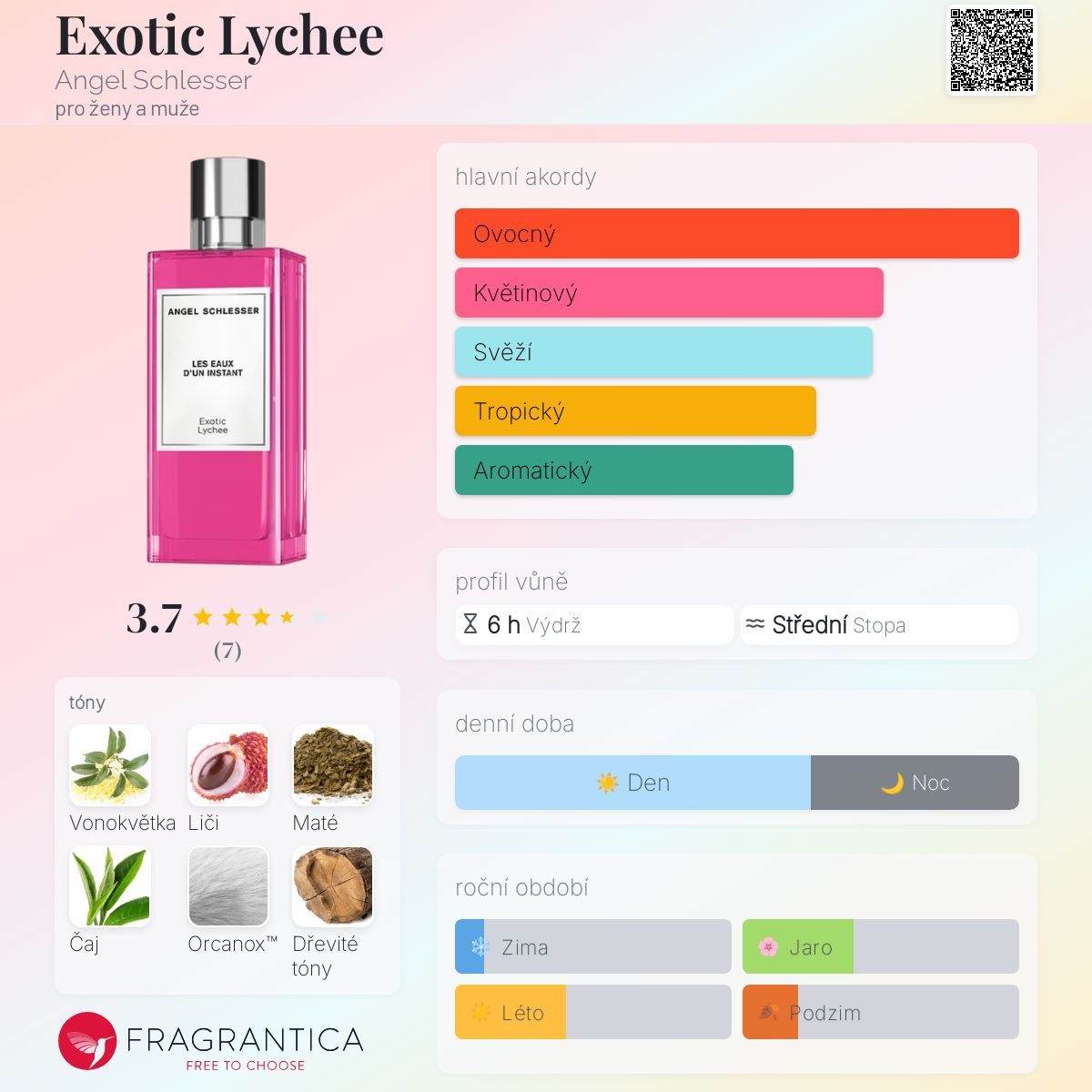 Exotic Lychee podle Angel Schlesser je Floral Fruity vůně pro ženy a muže. Toto je nová vůně. Exotic Lychee byl/a uveden/a v roce 2025. Vrchní tóny jsou Zelený čaj, Grapefruit a Limetka; střední tóny jsouVonokvětka, Liči a Maté ; základní tóny jsou Orcanox™, Vzácné dřevo a Pižmo.