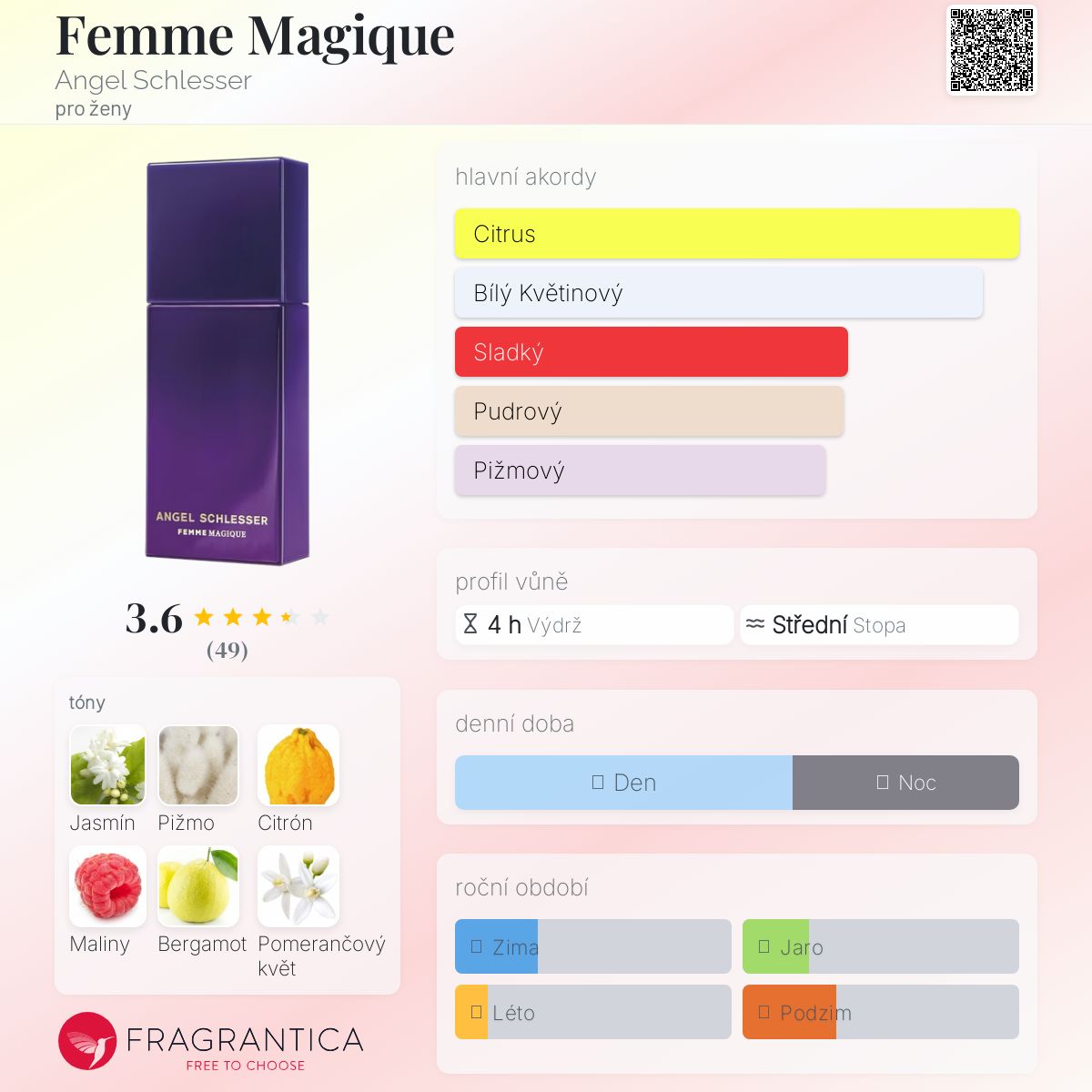 Femme Magique podle Angel Schlesser je Orientální Floral vůně pro ženy. Femme Magique byl/a uveden/a v roce 2021. "Nosem" za touto vůní je Ane Ayo. Vrchní tóny jsou Citrón, Maliny, Bergamot a Grapefruit; střední tóny jsouJasmín, Pomerančový květ, Kosatec a Gardénie ; základní tóny jsou Pižmo, Lékořice, Vanilka, Cedr a Jantar (ambra).