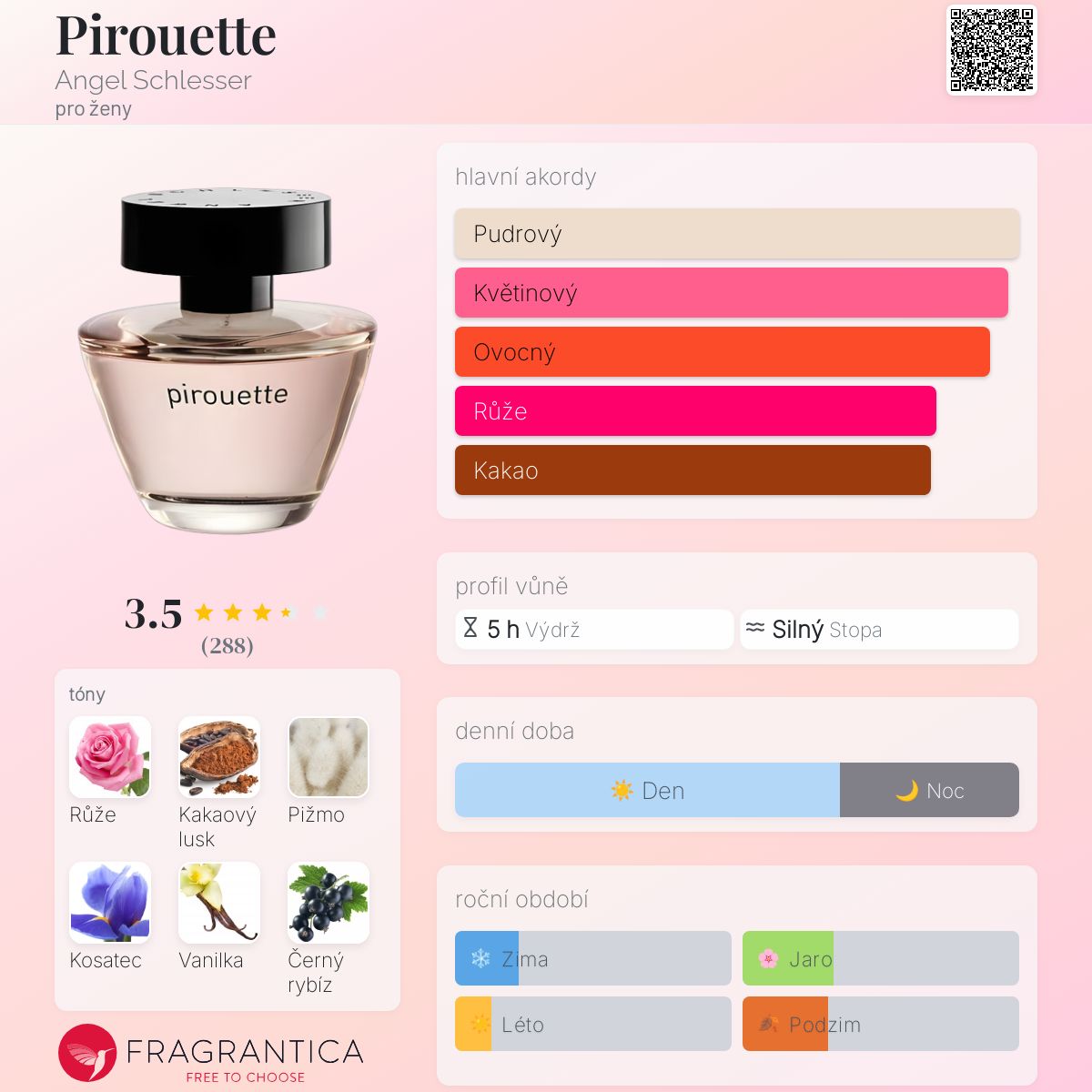 Pirouette podle Angel Schlesser je Floral Fruity vůně pro ženy. Pirouette byl/a uveden/a v roce 2012. Vrchní tóny jsou Růže, Černý rybíz, Švestka a Bergamot; střední tóny jsouKakaový lusk, Kosatec, Orchidej, Frézie, Konvalinka a Jasmín ; základní tóny jsou Bílé pižmo, Vanilka, Pačuli, Cedr a Jantar (ambra).