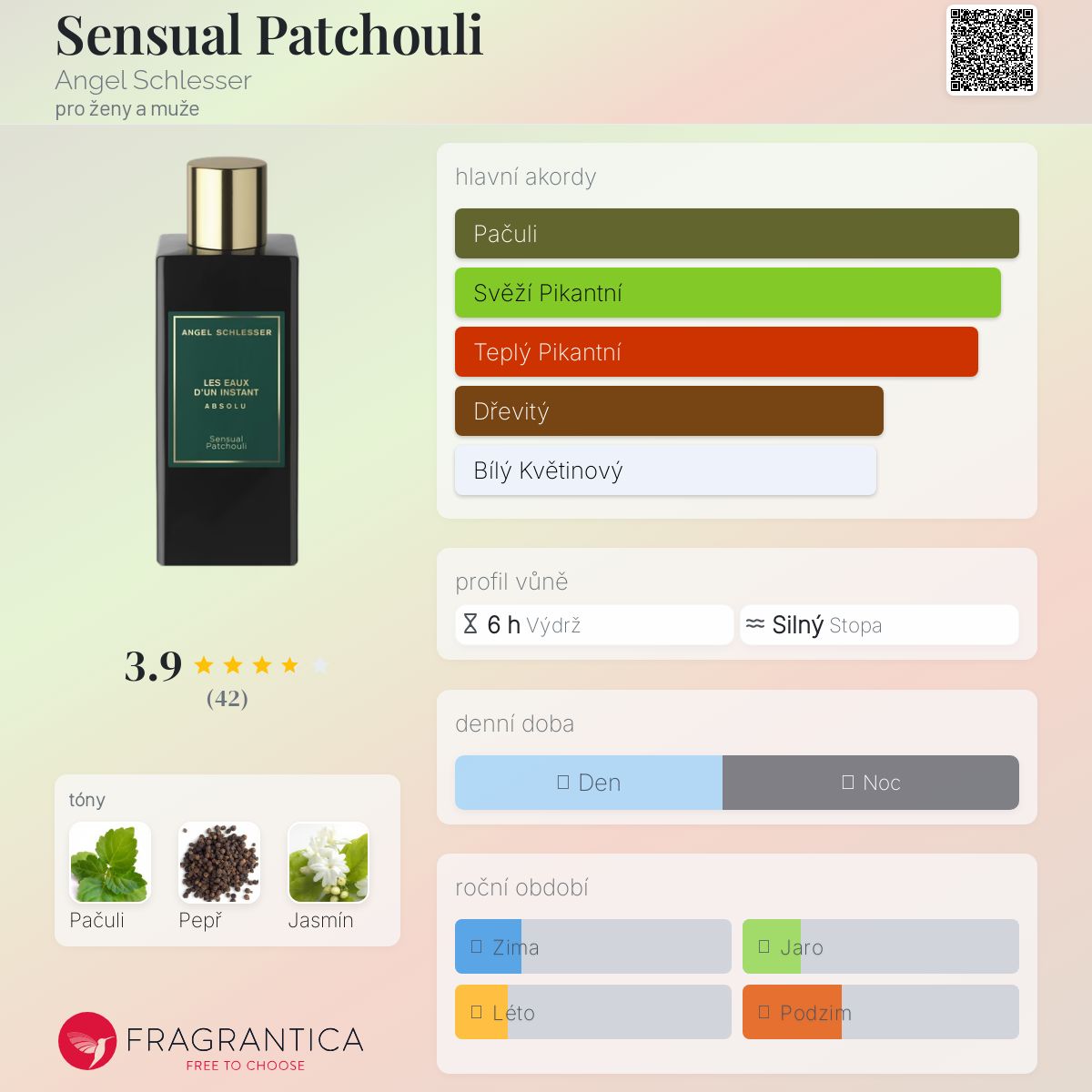 Sensual Patchouli podle Angel Schlesser je Woody Spicy vůně pro ženy a muže. Sensual Patchouli byl/a uveden/a v roce 2020. "Nosem" za touto vůní je Hamid Merati-Kashani. Vrchní tón je Černý pepř ; střední tón jeJasmín ; základní tón je Pačuli.