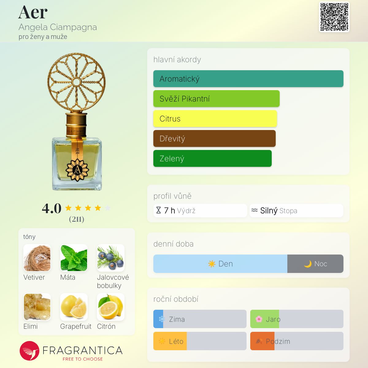 Aer podle Angela Ciampagna je Aromatic Green vůně pro ženy a muže. Aer byl/a uveden/a v roce 2015. "Nosem" za touto vůní je Angela Ciampagna. Vrchní tóny jsou Máta, Grapefruit a Citrón; střední tón jeJalovcové bobulky ; základní tóny jsou Vetiver, Elemi a Pačuli.