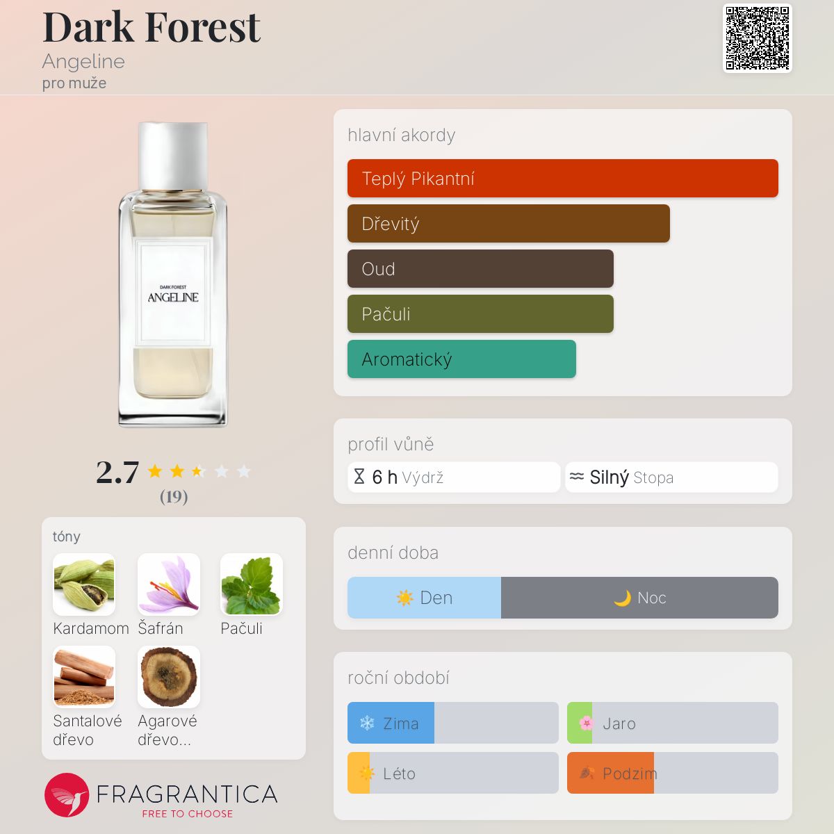 Dark Forest podle Angeline je Woody Spicy vůně pro muže. Toto je nová vůně. Dark Forest byl/a uveden/a v roce 2025. Vrchní tóny jsou Kardamom a Šafrán; střední tón jePačuli ; základní tóny jsou Santalové dřevo a Agarové dřevo (oud).