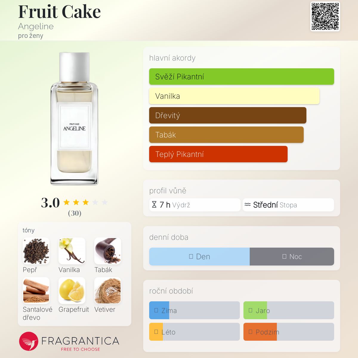 Fruit Cake podle Angeline je Orientální Vanilla vůně pro ženy. Toto je nová vůně. Fruit Cake byl/a uveden/a v roce 2025. Vrchní tóny jsou Pepř a Grapefruit; střední tóny jsouSantalové dřevo a Vetiver ; základní tóny jsou Vanilka a Tabák.