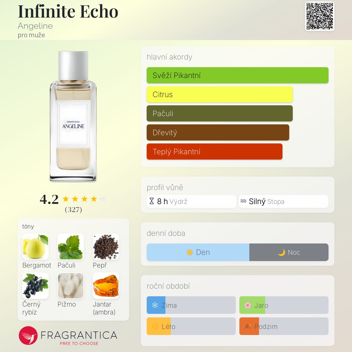 Infinite Echo podle Angeline je Woody Spicy vůně pro muže. Toto je nová vůně. Infinite Echo byl/a uveden/a v roce 2024. Vrchní tóny jsou Bergamot a Pepř; střední tóny jsouPačuli a Černý rybíz ; základní tóny jsou Pižmo a Jantar (ambra).