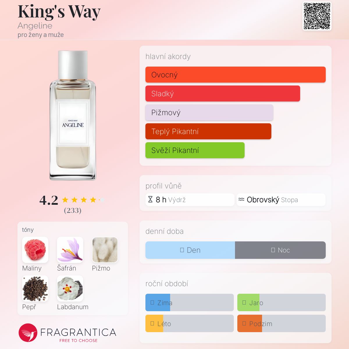 King's Way podle Angeline je Orientální vůně pro ženy a muže. Toto je nová vůně. King's Way byl/a uveden/a v roce 2024. Vrchní tón je Maliny ; střední tóny jsouŠafrán a Pepř ; základní tóny jsou Pižmo a Labdanum.
