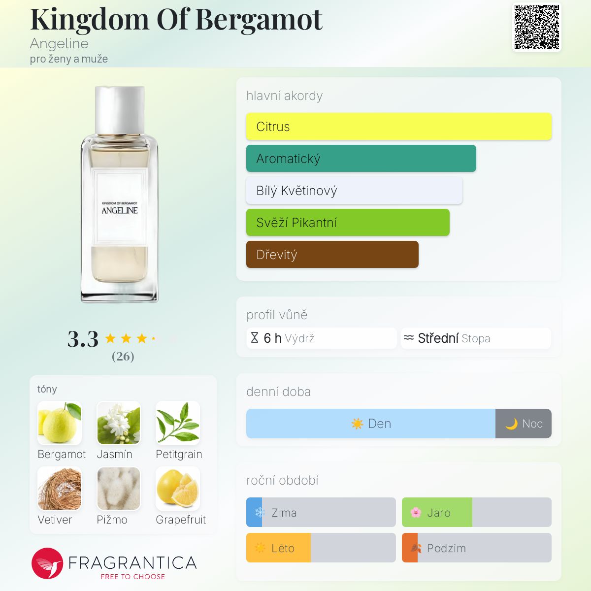 Kingdom Of Bergamot podle Angeline je Citrus vůně pro ženy a muže. Toto je nová vůně. Kingdom Of Bergamot byl/a uveden/a v roce 2025. Vrchní tóny jsou Bergamot a Grapefruit; střední tóny jsouJasmín, Petitgrain a Vetiver ; základní tóny jsou Pižmo, Vanilka a Cedr.