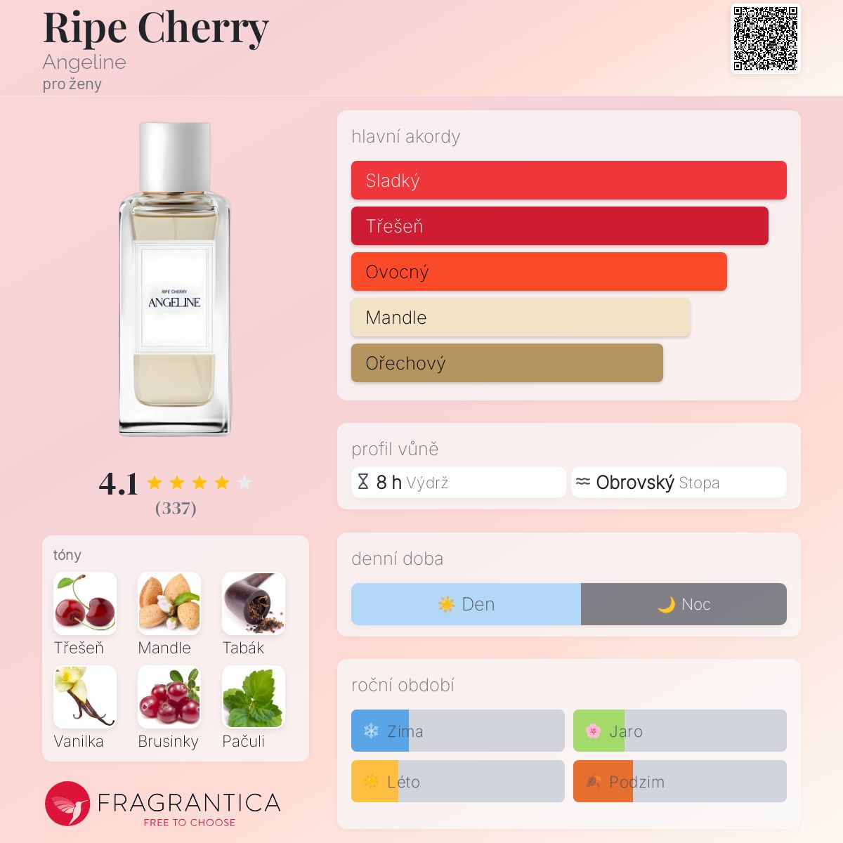 Ripe Cherry podle Angeline je Orientální Vanilla vůně pro ženy. Toto je nová vůně. Ripe Cherry byl/a uveden/a v roce 2024. Vrchní tóny jsou Mandle, Tabák a Brusinky; střední tóny jsouTřešeň, Pačuli, Růže, Pomerančový květ a Vetiver ; základní tón je Vanilka.