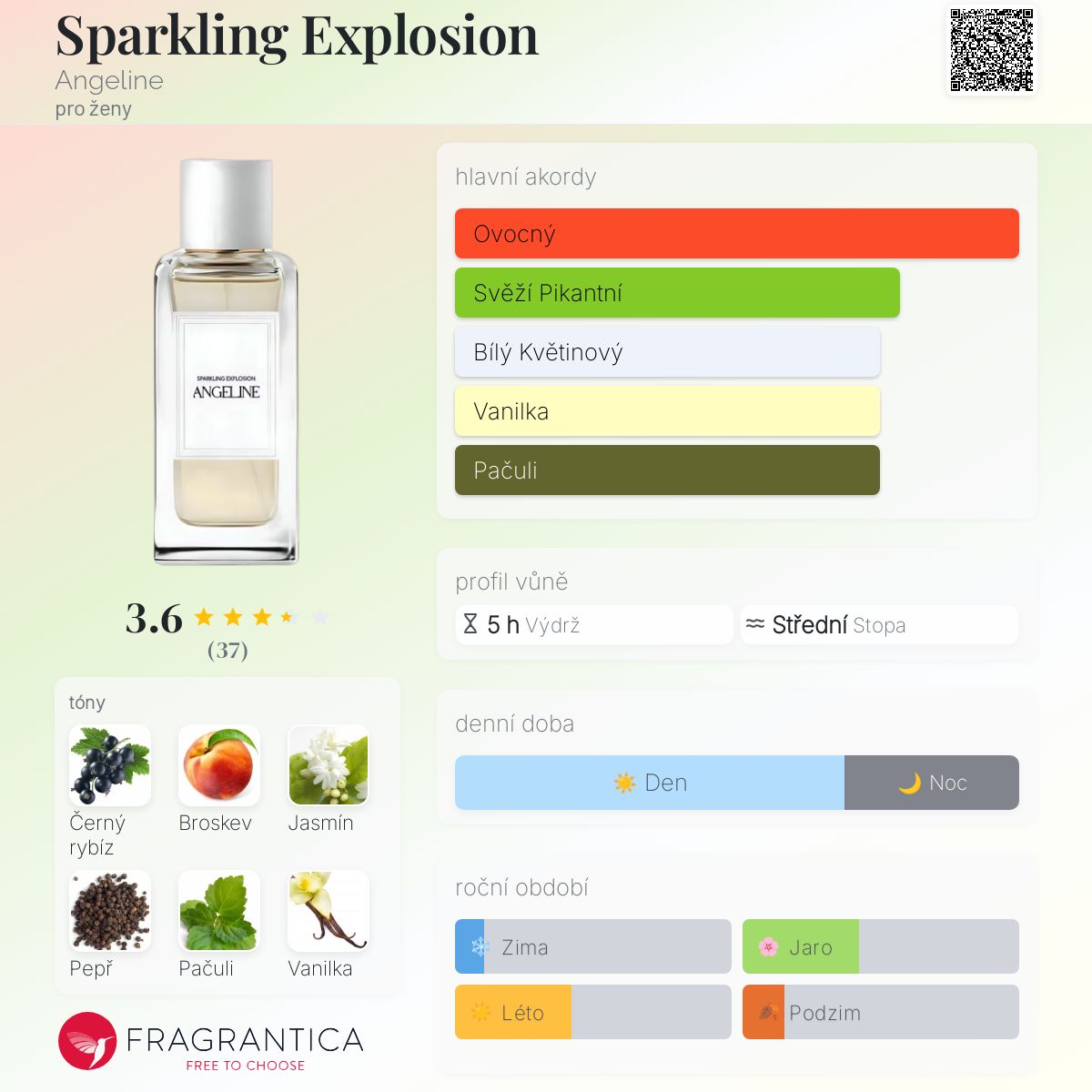 Sparkling Explosion podle Angeline je Floral Fruity Gourmand vůně pro ženy. Toto je nová vůně. Sparkling Explosion byl/a uveden/a v roce 2025. Vrchní tóny jsou Černý rybíz a Broskev; střední tóny jsouJasmín a Pepř ; základní tóny jsou Pačuli a Vanilka.