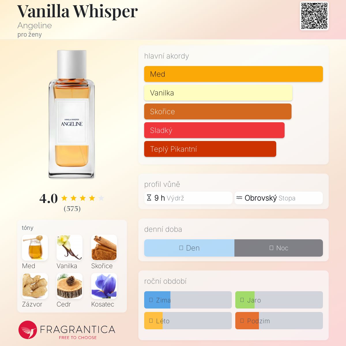 Vanilla Whisper podle Angeline je Orientální Spicy vůně pro ženy. Toto je nová vůně. Vanilla Whisper byl/a uveden/a v roce 2024. Vrchní tóny jsou Skořice a Zázvor; střední tóny jsouMed a Kosatec ; základní tóny jsou Vanilka a Cedr.