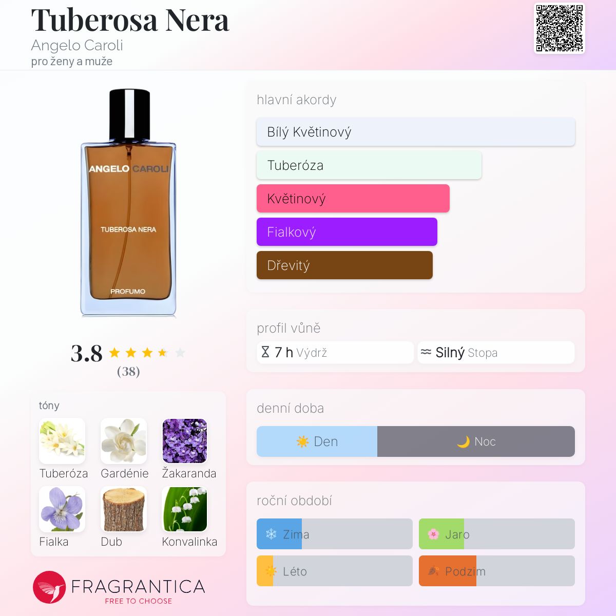 Tuberosa Nera podle Angelo Caroli je Floral vůně pro ženy a muže. Tuberosa Nera byl/a uveden/a v roce 2016. Vrchní tóny jsou Tuberóza a Citrusy; střední tóny jsouGardénie, Fialka a Konvalinka ; základní tóny jsou Žakaranda a Dub.