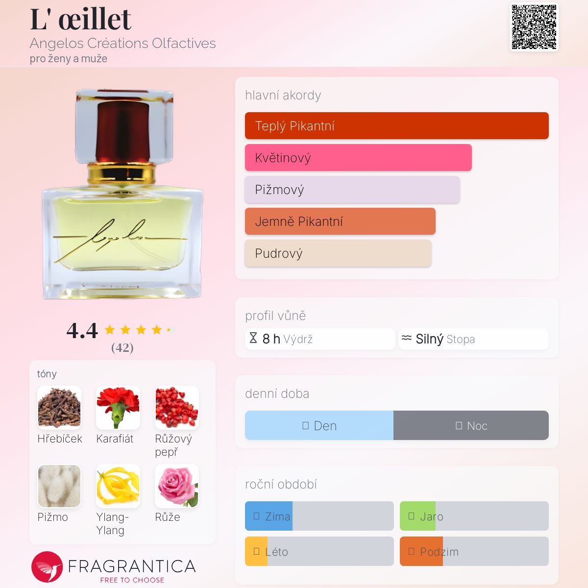 L' œillet podle Angelos Créations Olfactives je vůně pro ženy a muže. L' œillet byl/a uveden/a v roce 2018. "Nosem" za touto vůní je Angelos Balamis. Vrchní tóny jsou Karafiát, Růžový pepř a Konvalinka; střední tóny jsouHřebíček, Ylang-Ylang, Růže, Otočník a Tuberóza ; základní tóny jsou Pižmo a Vanilka.