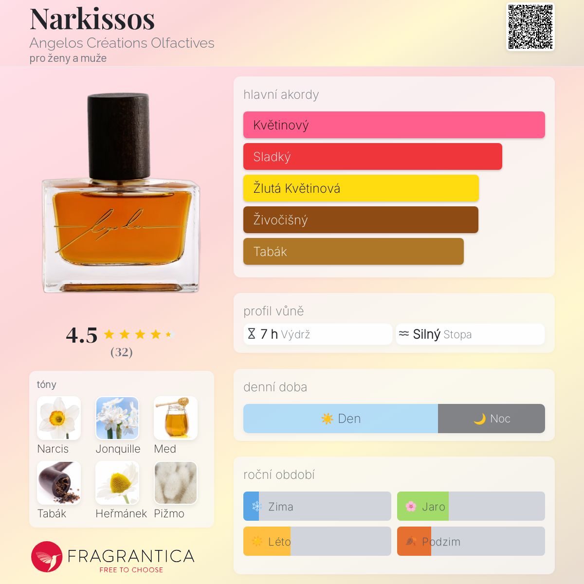 Narkissos podle Angelos Créations Olfactives je Floral Woody Musk vůně pro ženy a muže. Toto je nová vůně. Narkissos byl/a uveden/a v roce 2025. "Nosem" za touto vůní je Angelos Balamis. Vrchní tóny jsou Narcis, Heřmánek, Pižmo a Máslo; střední tóny jsouNarcis, Jonquille, Med, Pomerančový květ, Karafiát, Jasmín Sambac a Pelargónie ; základní tóny jsou Tabák, Ambrette (přírodní pižmo), Kůže, Vanilka, Benzoin, Pačuli a Jedle balzámová.