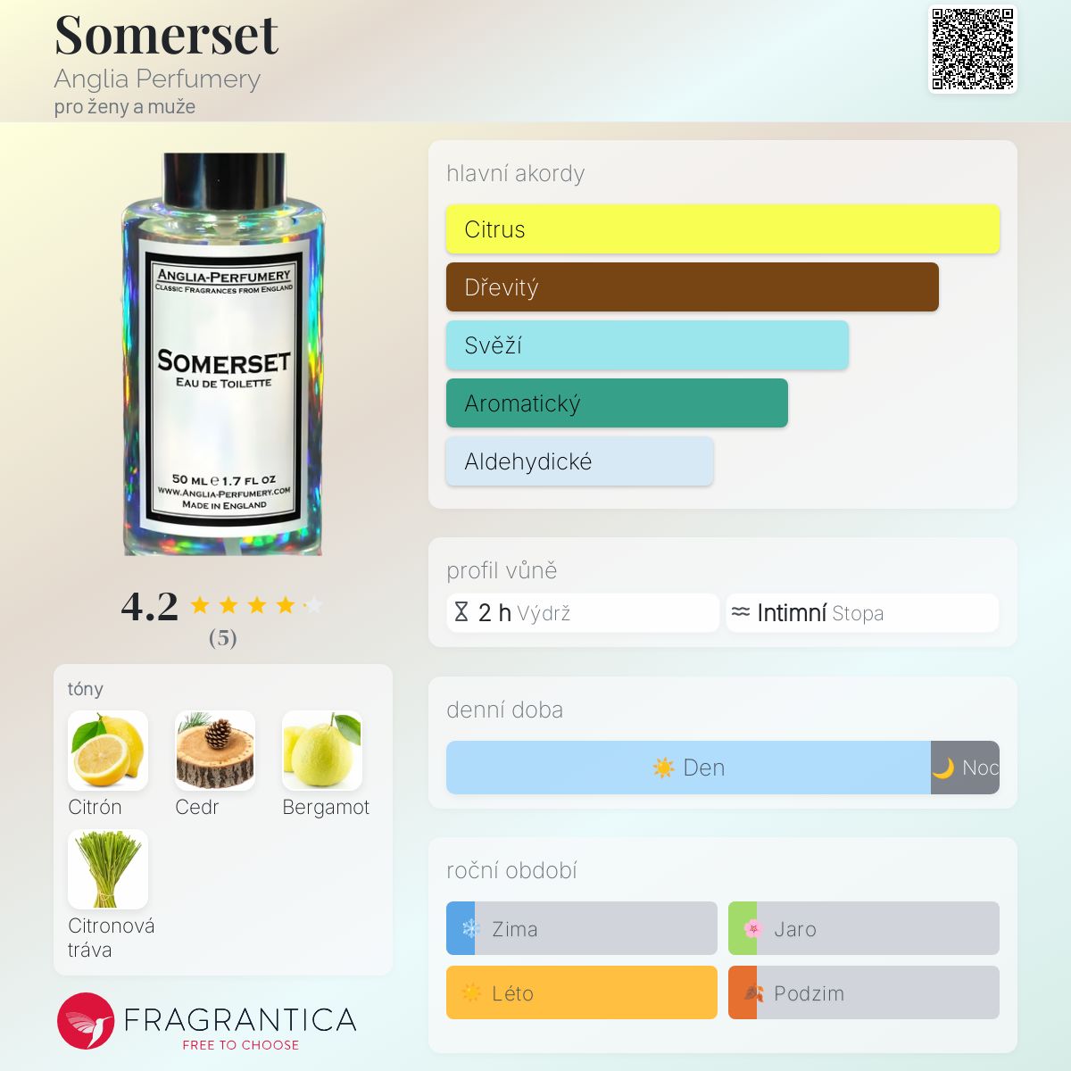 Somerset podle Anglia Perfumery je Citrus Aromatic vůně pro ženy a muže. Vrchní tóny jsou Citrón a Bergamot; střední tón jeCitronová tráva ; základní tón je Cedr.